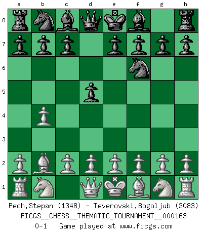 Last move : 0-1 2013 May 25 11:22:0 [Event "FICGS__CHESS__THEMATIC_TOURNAMENT__000163"] [Site "FICGS"] [Date "2013.04.14"] [Round "1"] [White "Pech,Stepan"] [Black "Teverovski,Bogoljub"] [Result "0-1"] [WhiteElo "1348"] [BlackElo "2083"] 1.b4 Nf6 2.Bb2 d5 0-1 This chess game has been lost on time (started : 2013.04.14 23:56:10) Polish (Sokolsky) opening Player Black won this chess game. Follow this game move after move (download)You need not play well - just help your opponent to play badly. (Genrikh Chepukaitis) Ich verstehe den Grund nicht, warum die Aufteilung in Frauen und Männer überhaupt im Schach besteht. (Judith Polgar) Cuando no sepas que mover, espera por una idea que se le venga a la la cabeza de tu oponente. Tenlo por seguro de que esa idea estará incorrecta. (Siegbert Tarrasch) Ce qui caractérise les parties de combat, c'est que si le défenseur a constamment de difficiles problèmes à résoudre, l'attaquant doit chercher sans relâche de nouvelles possibilités d'attaque. (Koblentz) It's unlucky to be superstitious. (Dave Enteles)