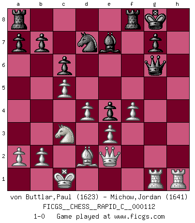 Last move : 1-0 2013 August 15 18:9:57 [Event "FICGS__CHESS__RAPID_C__000112"] [Site "FICGS"] [Date "2013.04.16"] [Round "1"] [White "von Buttlar,Paul"] [Black "Michow,Jordan"] [Result "1-0"] [WhiteElo "1623"] [BlackElo "1641"] 1.c4 e5 2.Nc3 Nf6 3.Nf3 d6 4.d4 e4 5.Nd2 Bf5 6.e3 c6 7.Be2 Be7 8.g4 Bg6 9.h4 h5 10.g5 Nh7 11.Ndxe4 d5 12.Nd2 O-O 13.Bxh5 Bxh5 14.Qxh5 Qd6 15.c5 Qe6 16.Qe2 Qf5 17.Nf1 f6 18.Ng3 Qg6 19.Bd2 fxg5 20.hxg5 Nxg5 21.O-O-O Nd7 22.f4 Ne4 23.Ngxe4 dxe4 24.Rdg1 1-0 This chess game has been lost on time (started : 2013.04.16 19:14:47) English Opening Kingside Castling by player Black (move 12) Queenside Castling by player White (move 21) Player White won this chess game. Follow this game move after move (download)Winning isn't everything... but losing is nothing. (Mednis) Besser ein falscher Plan, logisch durchgeführt, als gar kein Plan. (Viktor Kortschnoi) Tu no necesitas jugar muy bien, únicamente ayudar a tu oponenet a que juegue muy mal. (Genrikh Chepukaitis) Mais l'homme est une créature légère et illogique : semblable au joueur d'échecs, il n'aime que le processus du but à atteindre, non le but lui-même. (Dostoïevsky) Never was anything great achieved without danger. (Niccolo Machiavelli)