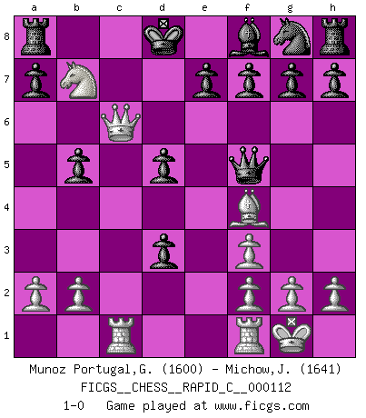 Last move : 1-0 2013 June 17 1:10:39 [Event "FICGS__CHESS__RAPID_C__000112"] [Site "FICGS"] [Date "2013.04.16"] [Round "1"] [White "Munoz Portugal,Guillermo"] [Black "Michow,Jordan"] [Result "1-0"] [WhiteElo "1600"] [BlackElo "1641"] 1.Nf3 d5 2.d4 Nc6 3.c4 Bg4 4.Nc3 dxc4 5.d5 Bxf3 6.exf3 Ne5 7.Bf4 Nd3+ 8.Bxd3 cxd3 9.O-O c6 10.Qa4 Qd7 11.Rad1 b5 12.Qa6 Rc8 13.Ne4 cxd5 14.Rc1 Ra8 15.Nc5 Qf5 16.Qc6 Kd8 17.Nb7 1-0 Reti Opening Kingside Castling by player White (move 9) Player White won this chess game. Follow this game move after move (download)In life, as in Chess, one's own Pawns block one's way. A man's very wealth, ease, leisure, children, books, which should help him to win, more often checkmate him. (Charles Buxton) Der Partner hat auch seine Existenzberechtigung. (Savielly Grigorievitsch Tartakower) Las Aperturas te enseñan aperturas. ¡Los Finales te enseñan Ajedrez!. (Stephan Gerzadowicz) Le jeu d'échecs fait naître et fortifie en nous plusieurs qualités précieuses dans le cours de l'existence, telles que la prévoyance, la circonspection, la prudence, et la persévérance. (Benjamin Franklin - 1783, la morale des échecs) If everyone is thinking alike, then somebody isn't thinking. (US General George S. Patton)