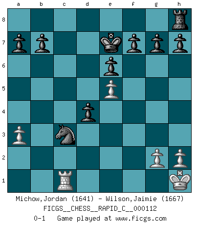 Last move : 0-1 2013 July 24 16:0:13 [Event "FICGS__CHESS__RAPID_C__000112"] [Site "FICGS"] [Date "2013.04.16"] [Round "1"] [White "Michow,Jordan"] [Black "Wilson,Jaimie"] [Result "0-1"] [WhiteElo "1641"] [BlackElo "1667"] 1.e4 e6 2.d4 d5 3.e5 c5 4.Nf3 cxd4 5.Nxd4 Ne7 6.Bb5+ Bd7 7.O-O Bxb5 8.Nxb5 Ng6 9.Re1 Nc6 10.f4 Qb6+ 11.Kh1 Qxb5 12.Qd3 Qxd3 13.cxd3 Nb4 14.Re2 Nxd3 15.Nc3 Ngxf4 16.Bxf4 Nxf4 17.Rd2 Bb4 18.Rd4 Bxc3 19.bxc3 Ne2 20.Rd3 Rc8 21.Re1 Rxc3 22.Rxc3 Nxc3 23.Rc1 d4 24.a3 Ke7 0-1 This chess game has been lost on time (started : 2013.04.16 19:14:47) French : Advance, Nimzovich system Kingside Castling by player White (move 7) Player Black won this chess game. Follow this game move after move (download)I thought the most common mistake [in chess] was the first one: Learning the game :P (Garvin Gray, FICGS forum) Ich habe die Schachforschung dermaßen betrieben, dass sie auf eine wissenschaftliche Basis gestellt wurde. (Mikhail Moiseyevich Botvinik) Desconfianza es la característica mas necesaria de un jugador de Ajedrez. (Siegbert Tarrasch) J'ai vu le vaincu d'Echecs jouer des années durant dans l'espoir de la fête de la victoire. Car tu es plus riche de ce qu'elle existe si même elle n'est point pour toi. Ainsi de la perle du fond des mers. (Antoine de Saint-Exupéry) There are two major products that came out of Berkeley: LSD and UNIX. We do not believe this is to be a coincidence. (Jeremy S. Anderson)