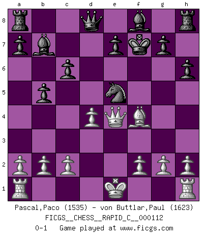 Last move : 0-1 2013 June 7 0:24:46 [Event "FICGS__CHESS__RAPID_C__000112"] [Site "FICGS"] [Date "2013.04.16"] [Round "1"] [White "Pascal,Paco"] [Black "von Buttlar,Paul"] [Result "0-1"] [WhiteElo "1535"] [BlackElo "1623"] 1.d4 d5 2.Nc3 c6 3.e4 dxe4 4.Bc4 Nf6 5.Bf4 Nbd7 6.Qe2 b5 7.Bxf7+ Kxf7 8.Nxe4 Nxe4 9.Qxe4 Bb7 10.Nf3 h6 11.Ne5+ Nxe5 0-1 This chess game has been lost on time (started : 2013.04.16 19:14:47) Queen's pawn : Chigorin variation Player Black won this chess game. Follow this game move after move (download)The Pawns are the soul of the game. (Francois Andre Danican Philidor) Im Leben werden Partien nie so unstrittig gewonnen wie im Spiel (Emanuel Lasker) Los tropiezos estan todos ahí en el tablero, esperando que se cometan. (Savielly Tartakover) Le système Elo représente seulement une moyenne. Il est simplement un indicateur de votre stabilité. (Anatoli Karpov) The right perception of any matter and a misunderstanding of the same matter do not wholly exclude each other. (Kafka's the trial)