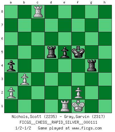 Last move : 1/2-1/2 2013 June 6 21:44:2 [Event "FICGS__CHESS__RAPID_SILVER__000111"] [Site "FICGS"] [Date "2013.04.17"] [Round "2"] [White "Nichols,Scott"] [Black "Gray,Garvin"] [Result "1/2-1/2"] [WhiteElo "2235"] [BlackElo "2317"] 1.e4 c6 2.d4 d5 3.Nd2 dxe4 4.Nxe4 Nd7 5.Nf3 Ngf6 6.Nc3 e6 7.Bd3 c5 8.O-O cxd4 9.Nxd4 Bc5 10.Nb3 Bd6 11.Re1 a6 12.g3 Qc7 13.Ne4 Nxe4 14.Bxe4 O-O 15.Bd2 Rb8 16.Bc3 Nf6 17.Bxf6 gxf6 18.Qg4+ Kh8 19.Bxh7 f5 20.Qh4 Kg7 21.g4 Bxh2+ 22.Qxh2 Qxh2+ 23.Kxh2 Rh8 24.Kg3 Rxh7 25.gxf5 Rh5 26.fxe6 Bxe6 27.Nd4 Kf6 28.Nxe6 fxe6 29.Re4 Rc8 30.c4 Rd8 31.Rae1 e5 32.b3 Rd2 33.R1e2 Rg5+ 34.Kf3 Rd3+ 35.R4e3 Rf5+ 36.Kg2 Rg5+ 37.Kf1 Rd1+ 38.Re1 Rd2 39.R3e2 Rd4 40.Rc2 Kf5 41.c5 a5 42.c6 bxc6 43.Rc5 Rd5 44.Rxc6 a4 45.Rc2 Rg4 46.Rc8 1/2-1/2 Caro-Kann : 3.Nd2 Kingside Castling by player White (move 8) Kingside Castling by player Black (move 14) This chess game ended in a draw. Follow this game move after move (download)After black's reply to 1.e4 with 1..e5, leaves him always trying to get into the game. (Howard Staunton) Vom Schach wurde gesagt das Leben sei dafür nicht lange genug. Aber das ist der Fehler des Lebens, nicht des Schach'. (Irving Chernev) Botvinnik trataba de restarle el misterio al Ajedrez, siempre relacionandolo a situaciones de la vida ordinaria. El gustaba de llamar al Ajedrez un típico problema inexacto similar a aquellos de los cuales la gente siempre tiene que enfrentarse en la vida cotidiana. (Garry Kasparov) La menace est plus forte que l'exécution. (Aaron Nimzovitch) Imagination is more important than knowledge. Knowledge is limited. Imagination encircles the world. (Albert Einstein)