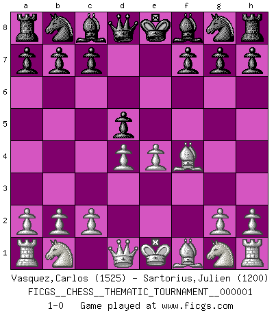 Last move : 1-0 2006 July 22 2:24:54 [Event "FICGS__CHESS__THEMATIC_TOURNAMENT__000001"] [Site "FICGS"] [Date "2006.05.19"] [Round "1"] [White "Vasquez,Carlos"] [Black "Sartorius,Julien"] [Result "1-0"] [WhiteElo "1525"] [BlackElo "1200"] 1.e4 e5 2.f4 exf4 3.d4 d5 4.Bxf4 1-0 This chess game has been lost on time (started : 2006.05.19 15:9:57) KGA : Villemson (Steinitz) gambit Player White won this chess game. Follow this game move after move (download)A win by an unsound combination, however showy, fills me with artistic horror. (Wilhelm Steinitz) Sehr viele beherrschen heutzutage das große Einmalseins des Schachspiels und kennen sogar dessen Logarithmentafeln auswendig - deshalb sollte man hin und wieder zu beweisen trachten, dass zwei mal zwei auch fünf sein kann. (Mikhail Nekhemyevich Tal) ¿Quién es tu oponente esta tarde? Esta tarde mi oponente son las piezas negras. (Akiba Rubinstein) En blitz, le Cavalier l'emporte sur le Fou. (Vlastimil Hort) The best teachers teach from the heart, not from the book. (Author unknown)