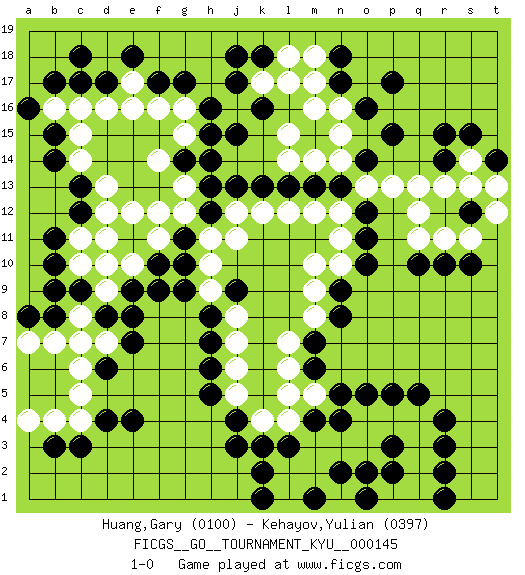 Last move : 1-0 2013 October 29 10:1:55 [Event "FICGS__GO__TOURNAMENT_KYU__000145"] [Site "FICGS"] [Date "2013.04.18"] [Round "1"] [Black "Huang,Gary"] [White "Kehayov,Yulian"] [Result "1-0"] [Rating 1 "0100"] [Rating 2 "0397"] 1.r15 c4 2.e4 d16 3.c3 c5 4.d4 c7 5.q5 q4 6.r4 q3 7.r3 q2 8.p5 o4 9.j3 k4 10.k3 l4 11.l3 m3 12.m4 m5 13.n4 n3 14.n5 l5 15.o5 p4 16.r2 l2 17.k2 l1 18.o2 o3 19.n2 m2 20.p2 q1 21.j4 j5 22.h5 j6 23.h6 j7 24.q10 d10 25.j17 l17 26.n17 l15 27.f17 e16 28.c13 d13 29.c12 d12 30.b10 c14 31.b14 c15 32.b15 b16 33.b8 c8 34.c9 d9 35.d8 d7 36.e8 p13 37.p15 n14 38.o14 o13 39.n13 n12 40.m13 m14 41.l13 l14 42.o12 m12 43.k13 l12 44.o11 k12 45.j13 j12 46.j15 n16 47.o16 n15 48.n18 m17 49.p17 m16 50.k16 m18 51.k18 m10 52.n9 m9 53.h7 j8 54.b3 b4 55.e7 b7 56.d6 c6 57.a8 c10 58.b9 c11 59.b11 d11 60.c17 c16 61.c18 e17 62.e18 f16 63.g17 g16 64.h16 g15 65.h12 h11 66.h13 g12 67.g10 h10 68.g9 h9 69.n8 m8 70.g11 f12 71.m6 l6 72.m7 l7 73.g14 f14 74.h14 g13 75.b17 f11 76.h8 n10 77.o10 n11 78.r1 n1 79.o1 p1 80.m1 q13 81.k1 n1 82.j9 j11 83.m1 r13 84.p3 r11 85.r10 s11 86.s10 s14 87.s15 q11 88.s12 t12 89.r14 s13 90.t14 q12 91.a16 k17 92.e9 e10 93.f9 t13 94.d17 a7 95.h15 l18 96.j18 a4 97.f10 e12 98.pass 1-0 Here are the names of the openings (joseki) played in the four corners : Corner d4 : c4 e4 Komoku (Somok, Xiao~mu`) 3-4 Point. The komoku (3-4) point is the traditional corner enclosure move.. Ikken Takagakari (Hankan Nop'dakeolch'im, Yi Gaogua`jiao~, 1-Space High Approach). The 5-4 approach move has become more popular in modern times, as modern Go emphasizes speed and influence. Corner q4 : q5 q4 Takamoku (Gomok, Gaomu`) 5-4 Point. The takamoku (high) point (5-4). With its emphasis on influence, the 5-4 point complements the 4-4 (hoshi) point in creating an influence-oriented fuseki. Corner d16 : d16 j17 Hoshi (Hwajeom, Seongjeom, Xingwei`) 4-4 Point. The star or hoshi (4-4) point, emphasizing influence at the potential expense of territory. Corner q16 : r15 l17 Mokuhazushi (Waemok, Wai`mu`) 5-3 Point. The mokuhazushi (5-3) point was popular in the Edo period in Japan (1600 - 1867). It emphasizes influence; territorially, it is inferior to the 3-4 point. Player Black won this Go (weiqi, baduk) game. Follow this game move after move (download)Five liberties for tactical stability. (Anonymous) A good teacher is like a candle - it consumes itself to light the way for others. (Author unknown)