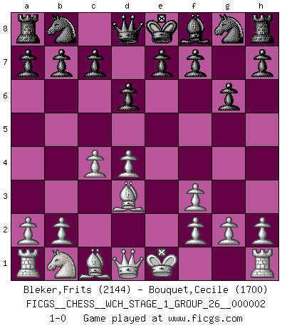 Last move : 1-0 2007 March 8 19:1:21 [Event "FICGS__CHESS__WCH_STAGE_1_GROUP_26__000002"] [Site "FICGS"] [Date "2007.01.30"] [Round "1"] [White "Bleker,Frits"] [Black "Bouquet,Cecile"] [Result "1-0"] [WhiteElo "2144"] [BlackElo "1700"] 1.d4 d6 2.Nf3 Bg4 3.c4 Bxf3 4.exf3 g6 5.Bd3 1-0 This chess game has been lost on time (started : 2007.01.30 17:52:4) Old Indian : Tartakower (Wade) variation Player White won this chess game. Follow this game move after move (download)To avoid losing a piece, many a person has lost the game. (Savielly Tartakover) Versuche, dich von der Sklaverei der Eröffnungsvarianten zu befreien. Stattdessen soll man gewisse Typenpositionen erlernen, die man eingehend analysiert. (Aaron Nimzowitsch) Con el fin de mejorar tu juego, debes de estudiar los finales antes que todo, ya que mientras que los finales pueden ser estudiados y dominados por sí mismos, el juegomedio y la apertura deben de ser estudiados en relación con los finales. (José Raúl Capablanca) Si le désir cupide (et stupide) de gagner est une inépuisable source de souffrance, une combinaison brillante sur l'échiquier est une découverte : le coquelicot qui s'épanouit lorsque apparaît la Voie Lactée. (Arrabal) Fortune favours the audacious. (Desiderius Erasmus)