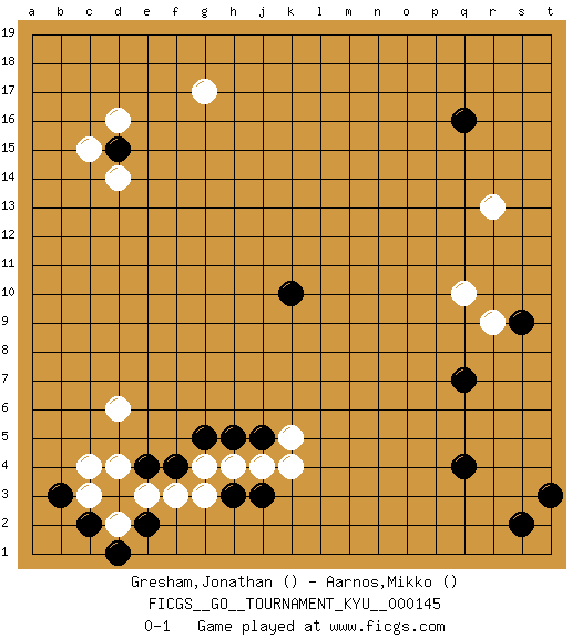 Last move : 0-1 2013 July 9 15:9:44 [Event "FICGS__GO__TOURNAMENT_KYU__000145"] [Site "FICGS"] [Date "2013.04.18"] [Round "1"] [Black "Gresham,Jonathan"] [White "Aarnos,Mikko"] [Result "0-1"] 1.k10 d4 2.d3 e3 3.e4 f3 4.f4 c3 5.b3 c4 6.e2 g3 7.h3 g4 8.g5 h4 9.h5 j4 10.j5 k5 11.j3 k4 12.c2 d2 13.d1 d16 14.q16 d6 15.q4 q10 16.s2 g17 17.q7 r13 18.s9 r9 19.d15 c15 20.t3 d14 0-1 This go game has been lost on time (started : 2013.04.18 14:47:48) Here are the names of the openings (joseki) played in the four corners : Corner d4 : d4 d3 Hoshi (Hwajeom, Seongjeom, Xingwei`) 4-4 Point. The star or hoshi (4-4) point, emphasizing influence at the potential expense of territory. Corner q16 : q16 r13 Hoshi (Hwajeom, Seongjeom, Xingwei`) 4-4 Point. The star or hoshi (4-4) point, emphasizing influence at the potential expense of territory. Niken Kakari (Dukan Keolch'im, E`r Gua`jiao~, 2-Space Low Approach). Black typically answers by 7-3 or 3-5 (which is not joseki). Player White won this Go (weiqi, baduk) game. Follow this game move after move (download)To invade, need 20 points in open area; otherwise, keshi is best. (Yang Yilun, 7p) Unless I accept my faults I will most certainly doubt my virtues. (Hugh Prather)