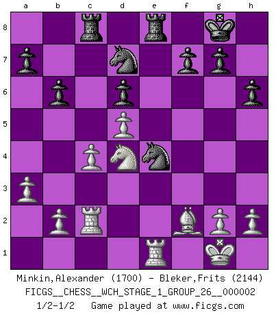 Last move : 1/2-1/2 2007 March 21 9:20:53 [Event "FICGS__CHESS__WCH_STAGE_1_GROUP_26__000002"] [Site "FICGS"] [Date "2007.01.30"] [Round "1"] [White "Minkin,Alexander"] [Black "Bleker,Frits"] [Result "1/2-1/2"] [WhiteElo "1700"] [BlackElo "2144"] 1.d4 Nf6 2.c4 e6 3.Nc3 Bb4 4.Qc2 O-O 5.a3 Bxc3+ 6.Qxc3 b6 7.Bg5 Bb7 8.e3 d6 9.Nf3 Nbd7 10.Bd3 Qe8 11.Qc2 c5 12.O-O h6 13.Bh4 e5 14.Nd2 cxd4 15.exd4 e4 16.Be2 e3 17.Bf3 Bxf3 18.Nxf3 Qe4 19.Rac1 exf2+ 20.Bxf2 Qxc2 21.Rxc2 Rfe8 22.d5 Rac8 23.Nd4 Ne4 24.Re1 1/2-1/2 Nimzo-Indian : Classical variation Kingside Castling by player Black (move 4) Kingside Castling by player White (move 12) This chess game ended in a draw. Follow this game move after move (download)You are for me the Queen on d8 and I am the Pawn on d7 !! (Eduard Gufeld) Der Knackpunkt bei der Konzentration ist, daß wir nur durch sie etwas Neues und Ungewöhnliches am Schachbrett finden können. Sie ist der einzige Weg durch neue neue Ideen eine Überraschung zu bereiten. (Garry Kasparov) Yo no creo en la psicologÃa. Yo creo en las buenas movidas. (Bobby Fischer) Un millionnaire : 'Monsieur Steinitz ! Vous ne participez aux tournois que pour l'argent, alors que moi je n'y viens que pour l'honneur.' Steinitz : 'Chacun joue pour ce qu'il n'a pas'... Perfection is achieved, not when there is nothing more to add, but when there is nothing left to take away. (Antoine de Saint-Exupéry)