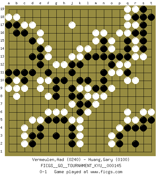 Last move : 0-1 2013 August 27 21:20:56 [Event "FICGS__GO__TOURNAMENT_KYU__000145"] [Site "FICGS"] [Date "2013.04.18"] [Round "1"] [Black "Vermeulen,Aad"] [White "Huang,Gary"] [Result "0-1"] [Rating 1 "0240"] [Rating 2 "0100"] 1.c16 e16 2.d15 c17 3.b17 d17 4.d13 j17 5.d3 r5 6.r16 p16 7.q14 r17 8.s17 q17 9.q11 r15 10.s15 r14 11.s14 r13 12.q13 s13 13.r18 q18 14.s19 r10 15.q4 q5 16.r4 p4 17.p3 o3 18.p2 o2 19.r2 d5 20.g3 c3 21.e3 c4 22.f5 c9 23.c11 k3 24.t18 q10 25.o12 p12 26.p13 p11 27.n13 o14 28.o13 m16 29.q15 q16 30.s16 q12 31.l13 j13 32.k10 b18 33.b16 b10 34.b11 k5 35.n10 o9 36.h10 e9 37.f11 l8 38.j8 f14 39.e12 f6 40.g5 g6 41.h5 h6 42.j2 k2 43.j3 c2 44.d2 k14 45.n14 o15 46.n15 n16 47.n9 n8 48.m9 m8 49.k7 l6 50.l7 m7 51.k6 j5 52.j4 k4 53.s5 s6 54.t5 t6 55.s4 q6 56.g8 f8 57.g9 f10 58.g10 j7 59.k8 g12 60.j12 h12 61.j11 o11 62.n11 e10 63.b9 b8 64.a10 a9 65.a11 a18 66.a17 q19 67.c10 r19 68.s18 b9 69.d11 l9 70.l10 k9 71.j9 e15 72.e14 f13 73.e13 e5 74.e4 k13 75.k12 l14 76.m13 m15 0-1 Here are the names of the openings (joseki) played in the four corners : Corner d16 : c16 e16 Komoku (Somok, Xiao~mu`) 3-4 Point. The komoku (3-4) point is the traditional corner enclosure move.. Ikken Takagakari (Hankan Nop'dakeolch'im, Yi Gaogua`jiao~, 1-Space High Approach). The 5-4 approach move has become more popular in modern times, as modern Go emphasizes speed and influence. Corner q16 : r16 p16 Komoku (Somok, Xiao~mu`) 3-4 Point. The komoku (3-4) point is the traditional corner enclosure move.. Ikken Takagakari (Hankan Nop'dakeolch'im, Yi Gaogua`jiao~, 1-Space High Approach). The 5-4 approach move has become more popular in modern times, as modern Go emphasizes speed and influence. Corner q4 : r5 q4 Mokuhazushi (Waemok, Wai`mu`) 5-3 Point. The mokuhazushi (5-3) point was popular in the Edo period in Japan (1600 - 1867). It emphasizes influence; territorially, it is inferior to the 3-4 point. Corner d4 : d3 d5 Komoku (Somok, Xiao~mu`) 3-4 Point. The komoku (3-4) point is the traditional corner enclosure move.. Ikken Takagakari (Hankan Nop'dakeolch'im, Yi Gaogua`jiao~, 1-Space High Approach). The 5-4 approach move has become more popular in modern times, as modern Go emphasizes speed and influence. Player White won this Go (weiqi, baduk) game. Follow this game move after move (download)Don't overlook the edge of the board. (Anonymous) God is an atheist. (Unknown)