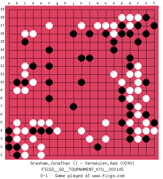 Last move : 0-1 2013 August 2 5:1:3 [Event "FICGS__GO__TOURNAMENT_KYU__000145"] [Site "FICGS"] [Date "2013.04.18"] [Round "1"] [Black "Gresham,Jonathan"] [White "Vermeulen,Aad"] [Result "0-1"] [Rating 2 "0240"] 1.k10 d3 2.d4 c4 3.c3 b3 4.b2 c2 5.d2 e2 6.d1 c1 7.b1 e1 8.a2 r4 9.q4 r3 10.s3 s4 11.q3 r7 12.q7 r6 13.q6 r9 14.q10 q17 15.r5 s5 16.t5 t4 17.s6 q5 18.p5 c16 19.r8 q8 20.p8 s8 21.a3 b4 22.a4 b5 23.c15 d16 24.j16 f17 25.f12 k4 26.f8 d10 27.m2 l3 28.k13 k17 29.l13 r11 30.j7 q11 31.q16 r16 32.r17 s17 33.s16 r18 34.r15 d5 35.e4 e5 36.f4 f5 37.r17 g4 38.p17 q18 39.t17 p18 40.p16 o17 41.s18 o16 42.o15 m17 43.n16 n17 44.c10 c9 45.o14 o11 46.f10 c11 47.b10 b9 48.d12 c12 49.f14 n3 50.l16 n5 51.q12 r12 52.q13 p10 53.p9 q9 54.s10 r10 0-1 This go game has been lost on time (started : 2013.04.18 14:47:48) Here are the names of the openings (joseki) played in the four corners : Corner d4 : d3 d4 Komoku (Somok, Xiao~mu`) 3-4 Point. The komoku (3-4) point is the traditional corner enclosure move.. Corner q4 : r4 q4 Komoku (Somok, Xiao~mu`) 3-4 Point. The komoku (3-4) point is the traditional corner enclosure move.. Corner d16 : c16 c15 Komoku (Somok, Xiao~mu`) 3-4 Point. The komoku (3-4) point is the traditional corner enclosure move.. Corner q16 : q17 l13 Komoku (Somok, Xiao~mu`) 3-4 Point. The komoku (3-4) point is the traditional corner enclosure move.. Player White won this Go (weiqi, baduk) game. Follow this game move after move (download)Do not fear furikawari. (Anonymous) There is a very easy way to return from a casino with a small fortune : go there with a large one. (Jack Yelton)