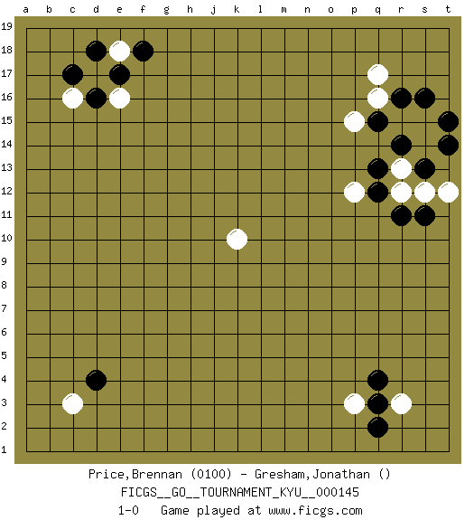 Last move : 1-0 2013 July 9 15:9:44 [Event "FICGS__GO__TOURNAMENT_KYU__000145 "] [Site "FICGS"] [Date "2013.04.18"] [Round "1"] [Black "Price,Brennan "] [White "Gresham,Jonathan "] [Result "1-0"] [Rating 1 "0100"] 1.r16 q16 2.q15 r15 3.r14 s15 4.s16 q17 5.t15 s14 6.s13 r13 7.t14 k10 8.d16 c16 9.c17 d17 10.e17 e16 11.d18 e18 12.f18 p15 13.q13 r12 14.q12 p12 15.r11 s12 16.s11 t12 17.q4 c3 18.d4 r3 19.q3 p3 20.q2 1-0 This go game has been lost on time (started : 2013.04.18 14:47:48) Here are the names of the openings (joseki) played in the four corners : Corner q16 : r16 q16Komoku (Somok, Xiao~mu`) 3-4 Point. The komoku (3-4) point is the traditional corner enclosure move.. Corner d16 : d16 c16Hoshi (Hwajeom, Seongjeom, Xingwei`) 4-4 Point. The star or hoshi (4-4) point, emphasizing influence at the potential expense of territory. Corner d4 : c3 d4San-San (Sam-Sam, San-San) 3-3 Point. The San-San (3-3) point, emphasizing territory at the expense of influence.Kata-tsuki (shoulder hit). The shoulder-hit is the traditional answer to the 3-3. The direction of White 3 depends on the positions on the side. Crawling once may be the premise for a follow-up move of sliding with a knight's move in the opposite direction. If White plays 3 at 3-4 (to the right), the follow-on knight's move is then played at the top (e.g. 3-4, 4-5, 5-2). White's knight's move reduces territory potential on the side it is played. Corner q4 : q4 r3Hoshi (Hwajeom, Seongjeom, Xingwei`) 4-4 Point. The star or hoshi (4-4) point, emphasizing influence at the potential expense of territory. Player Black won this Go (weiqi, baduk) game.Follow this game move after move (download ) If you don't know ladders, don't play go. (Anonymous) Logic : The art of thinking and reasoning in strict accordance with the limitations and incapacities of the human misunderstanding. (Ambrose Bierce)