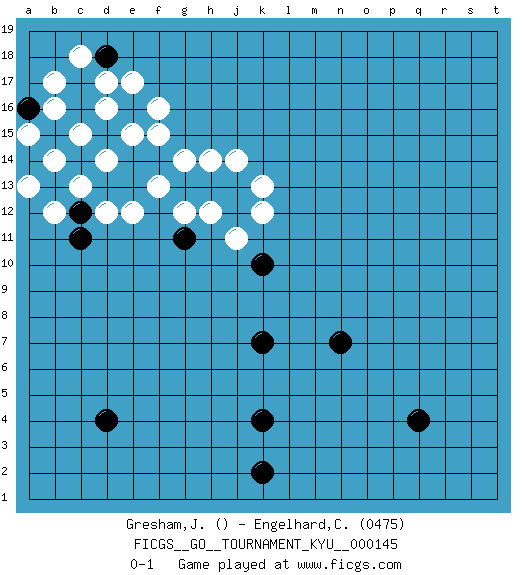 Last move : 0-1 2013 July 11 3:57:2 [Event "FICGS__GO__TOURNAMENT_KYU__000145"] [Site "FICGS"] [Date "2013.04.18"] [Round "1"] [Black "Gresham,Jonathan"] [White "Engelhard,Christof"] [Result "0-1"] [Rating 2 "0475"] 1.k10 d16 2.d15 f15 3.e16 d17 4.c16 e17 5.c17 e15 6.e14 f16 7.f14 g14 8.g13 h14 9.h13 j14 10.j13 k13 11.q4 j11 12.d4 d14 13.k4 f13 14.j12 k12 15.k7 g12 16.g11 h12 17.k2 c15 18.b15 b14 19.a14 b16 20.a16 a15 21.b13 c18 22.d18 b17 23.e13 e12 24.d13 c13 25.c12 d12 26.n7 b12 27.c11 a13 0-1 Here are the names of the openings (joseki) played in the four corners : Corner d16 : d16 d15 Hoshi (Hwajeom, Seongjeom, Xingwei`) 4-4 Point. The star or hoshi (4-4) point, emphasizing influence at the potential expense of territory. Player White won this Go (weiqi, baduk) game. Follow this game move after move (download)Territory is a closed space where time no longer exists. The transformation around it slower alter it, and sometimes it cracks open like a rotten egg at the least shock. (Pierre Audouard) The intuitive mind is a sacred gift; the rational mind is a faithful servant. We have created a society that honors the servant but has forgotten the gift. (Albert Einstein)