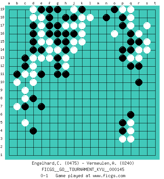 Last move : 0-1 2013 July 19 16:42:55 [Event "FICGS__GO__TOURNAMENT_KYU__000145"] [Site "FICGS"] [Date "2013.04.18"] [Round "1"] [Black "Engelhard,Christof"] [White "Vermeulen,Aad"] [Result "0-1"] [Rating 1 "0475"] [Rating 2 "0240"] 1.d16 q3 2.d4 r16 3.p4 q4 4.p5 q5 5.q6 p3 6.r10 r13 7.q12 e17 8.d17 e16 9.d15 d10 10.e7 c8 11.r12 q13 12.p13 o16 13.f16 e15 14.e14 f15 15.g16 k16 16.f17 g14 17.g15 f14 18.h14 e13 19.d14 c5 20.c7 b7 21.d8 c9 22.g13 f13 23.q14 r14 24.q16 q17 25.r15 s15 26.q15 s17 27.p14 s14 28.p17 q18 29.p18 p19 30.o19 q19 31.n18 h13 32.g12 h12 33.g11 d13 34.c13 d12 35.e11 d11 36.c12 c11 37.b11 b10 38.h11 j14 39.h15 j15 40.j16 j17 41.h16 h17 42.f18 e18 43.e19 d19 44.f19 d18 45.h18 k18 46.j18 k15 47.k19 l18 48.g17 k17 49.g19 j19 0-1 Here are the names of the openings (joseki) played in the four corners : Corner q4 : q3 p4 Komoku (Somok, Xiao~mu`) 3-4 Point. The komoku (3-4) point is the traditional corner enclosure move.. Corner d16 : d16 e17 Hoshi (Hwajeom, Seongjeom, Xingwei`) 4-4 Point. The star or hoshi (4-4) point, emphasizing influence at the potential expense of territory. Player White won this Go (weiqi, baduk) game. Follow this game move after move (download)There is damezumari at the bamboo joint. (Anonymous) If you know the enemy and know yourself you need not fear the results of a hundred battles. (Sun Tzu)