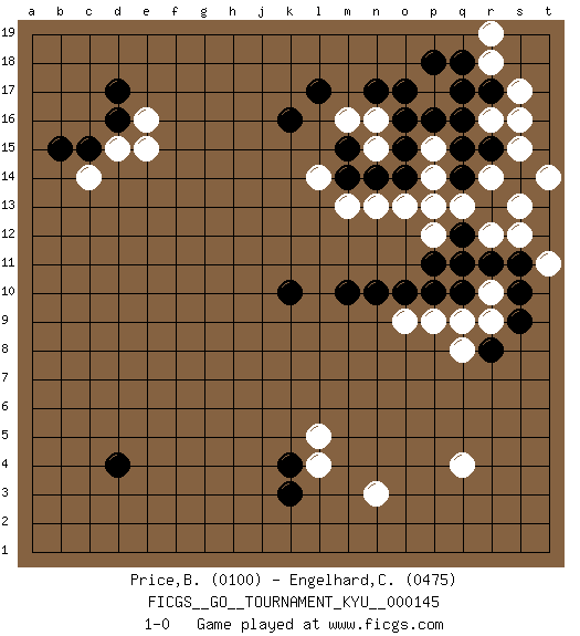 Last move : 1-0 2013 August 12 6:8:37 [Event "FICGS__GO__TOURNAMENT_KYU__000145"] [Site "FICGS"] [Date "2013.04.18"] [Round "1"] [Black "Price,Brennan"] [White "Engelhard,Christof"] [Result "1-0"] [Rating 1 "0100"] [Rating 2 "0475"] 1.q16 q4 2.d17 e16 3.d16 e15 4.d4 c14 5.c15 d15 6.b15 n3 7.k3 l4 8.k4 l5 9.k16 r10 10.k10 p15 11.q15 p14 12.q14 q13 13.r13 r12 14.q12 p13 15.r11 s12 16.p11 r14 17.r15 s13 18.s11 t11 19.q10 s15 20.s10 r9 21.s9 q9 22.o10 p9 23.p10 p12 24.q11 q17 25.p16 p17 26.o16 n16 27.o15 n15 28.o14 o13 29.n14 n13 30.m14 m13 31.n17 t14 32.o17 r16 33.r17 s16 34.q18 r18 35.p18 s17 36.q17 r19 37.r8 o9 38.m10 q8 39.n10 l14 40.m15 m16 41.l17 1-0 This go game has been lost on time (started : 2013.04.18 14:47:48) Here are the names of the openings (joseki) played in the four corners : Corner d16 : d17 e16 Komoku (Somok, Xiao~mu`) 3-4 Point. The komoku (3-4) point is the traditional corner enclosure move.. Corner q16 : q16 p15 Hoshi (Hwajeom, Seongjeom, Xingwei`) 4-4 Point. The star or hoshi (4-4) point, emphasizing influence at the potential expense of territory. Player Black won this Go (weiqi, baduk) game. Follow this game move after move (download)Balance is not what players strike for, and if it does arise, it is in spite of them. (Pierre Audouard) A computer lets you make more mistakes faster than any invention in human history - with the possible exceptions of handguns and tequila. (Mitch Ratcliffe)