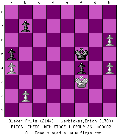Last move : 1-0 2007 February 23 18:41:52 [Event "FICGS__CHESS__WCH_STAGE_1_GROUP_26__000002"] [Site "FICGS"] [Date "2007.01.30"] [Round "1"] [White "Bleker,Frits"] [Black "Werbickas,Brian"] [Result "1-0"] [WhiteElo "2144"] [BlackElo "1700"] 1.Nf3 f5 2.g3 Nf6 3.Bg2 d6 4.d4 g6 5.O-O Bg7 6.c4 c6 7.Nc3 O-O 8.d5 e5 9.dxe6 Bxe6 10.Qd3 Na6 11.Ng5 Qe7 12.Bf4 Rad8 13.Rad1 Ne8 14.Qe3 Nac7 15.Nd5 cxd5 16.cxd5 Be5 17.Bxe5 dxe5 18.Nxe6 Nxe6 19.Qxe5 Qg7 20.Qxe6+ Rf7 21.Rd2 Qf8 22.d6 Rxd6 23.Rxd6 Nxd6 24.Rd1 Ne4 25.Bxe4 fxe4 26.Rd7 Kg7 27.Rxf7+ Qxf7 28.Qxf7+ Kxf7 29.f4 exf3 30.exf3 Ke6 31.Kf2 Kf5 32.Ke3 Ke5 33.g4 g5 34.f4+ gxf4+ 35.Kf3 h6 36.h3 a6 37.h4 a5 38.a4 h5 39.gxh5 Kf5 40.h6 1-0 Reti v Dutch Kingside Castling by player White (move 5) Kingside Castling by player Black (move 7) 10 pieces endgame at move 34 : White KPPPP , Black KPPPP WHITE : King + 4 Pawns BLACK : King + 4 Pawns 9 pieces endgame at move 39 : White KPPPP , Black KPPP WHITE : King + 4 Pawns BLACK : King + 3 Pawns Player White won this chess game. Follow this game move after move (download)Chess is 99 percent tactics. (Teichmann) Nie in meinem Leben habe ich die französische Verteidigung gespielt, welche die Stumpfsinnigste von allen ist. (Wilhelm Steinitz) No solamente yo pronostico su triunfo sobre Botvinnik, sino que me adelanto y digo que probablemente Fischer es el jugador de Ajedrez mas grande que haya existido. (John Collins) Le jeu d'échecs fait naître et fortifie en nous plusieurs qualités précieuses dans le cours de l'existence, telles que la prévoyance, la circonspection, la prudence, et la persévérance. (Benjamin Franklin - 1783, la morale des échecs) I can't decide which is riskier; taking crazy risks, or taking advice on crazy risks from a crazy risk taker. (Gregory House in House M.D.)