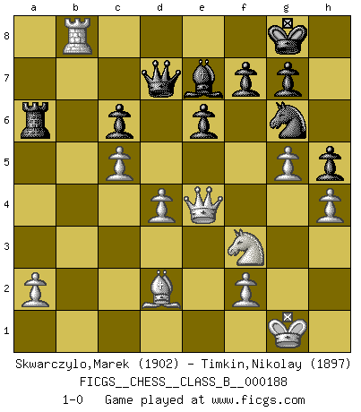 Last move : 1-0 2013 September 14 13:53:32 [Event "FICGS__CHESS__CLASS_B__000188"] [Site "FICGS"] [Date "2013.04.18"] [Round "1"] [White "Skwarczylo,Marek"] [Black "Timkin,Nikolay"] [Result "1-0"] [WhiteElo "1902"] [BlackElo "1897"] 1.d4 Nf6 2.Nf3 d5 3.c4 e6 4.Nc3 c6 5.e3 Nbd7 6.Qc2 Bd6 7.g4 h6 8.Bd2 dxc4 9.Bxc4 b5 10.Be2 Bb7 11.e4 Be7 12.e5 b4 13.exf6 bxc3 14.bxc3 Nxf6 15.Rb1 Rb8 16.c4 O-O 17.c5 Qc7 18.h3 Nd5 19.h4 Rfd8 20.g5 Nf4 21.Bc4 h5 22.Qe4 Ng6 23.O-O Re8 24.Rb3 Rbd8 25.Ra3 Qd7 26.Rxa7 Ra8 27.Rxa8 Rxa8 28.Rb1 Ba6 29.Bxa6 Rxa6 30.Rb8+ 1-0 Queen's pawn game Kingside Castling by player Black (move 16) Kingside Castling by player White (move 23) Player White won this chess game. Follow this game move after move (download)The passion for playing Chess is one of the most unaccountable in the world. (H.G. Wells) Ich verlor meine Bürgerrechte, mein Gehalt wurde mir nicht mehr bezahlt und ich wurde zensiert und durfte nicht mehr ins Ausland reisen. [nach dem Match Fischer-Taimanov 6:0] (Mark Taimanov) Me gusta decir que Bobby Fischer fue el mejor jugador que jamás haya existido. Pero lo que hizo de Fischer un genio, fue su habilidad de mezclar una frescura y pragmatismo Americano con ideas Rusas acerca de la estrategia. (Bruce Pandolfini) Ne tendez aucun piège pour le plaisir ! Ne jouez rien dans l'espoir que l'adversaire réagisse de façon stupide ! Prenez toujours pour acquis que l'adversaire va trouver le meilleur coup ! Ne jouez jamais de coup dans l'espoir que l'adversaire ne voie pas la menace ! Chacun de vos coups doit améliorer la position d'une façon ou d'une autre. If you work for a living, why do you kill yourself working ? (Tuco to a chicken in The Good, The Bad and The Ugly)