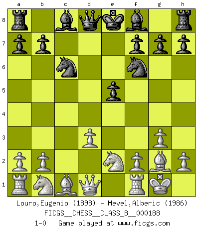 Last move : 1-0 2013 June 1 0:0:21 [Event "FICGS__CHESS__CLASS_B__000188"] [Site "FICGS"] [Date "2013.04.18"] [Round "1"] [White "Louro,Eugenio"] [Black "Mevel,Alberic"] [Result "1-0"] [WhiteElo "1898"] [BlackElo "1986"] 1.e4 c5 2.g3 d5 3.Bg2 dxe4 4.Bxe4 Nf6 5.Bg2 Nc6 6.Ne2 e5 7.d3 c4 8.O-O cxd3 9.cxd3 1-0 This chess game has been lost on time (started : 2013.04.18 22:36:18) Sicilian : Steinitz variation Kingside Castling by player White (move 8) Player White won this chess game. Follow this game move after move (download)We must make sure that Chess will not be like a dead language, very interesting, but for a very small group. (Sytze Faber) Die Jungen erwarten, dass Opa einfach umfällt. Dann aber kann Opa fünf Stunden lang Schach spielen und die jungen Gegner an die Wand drücken. (Viktor Kortschnoi) En manos de Fischer's, una diminuta ventaja teórica es tan buena como tener una Reina de ventaja. (Isaac Kashdan) Il vaut toujours mieux jouer un plan faux de façon logique que de n'avoir pas de plan du tout. (Victor Kortchnoï) The mind is like a parachute, it only functions when its open. (Unknown)