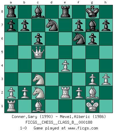 Last move : 1-0 2013 July 12 6:57:58 [Event "FICGS__CHESS__CLASS_B__000188"] [Site "FICGS"] [Date "2013.04.18"] [Round "1"] [White "Conner,Gary"] [Black "Mevel,Alberic"] [Result "1-0"] [WhiteElo "1990"] [BlackElo "1986"] 1.d4 Nf6 2.c4 g6 3.Nf3 Bg7 4.g3 O-O 5.Bg2 d6 6.Nc3 Nbd7 7.O-O e5 8.e4 c6 9.h3 Qb6 10.Re1 exd4 11.Nxd4 Re8 12.Re2 Qb4 13.Nc2 Qxc4 14.Qxd6 Qc5 15.Qxc5 1-0 This chess game has been lost on time (started : 2013.04.18 22:36:18) King's Indian, 3.Nf3 Kingside Castling by player Black (move 4) Kingside Castling by player White (move 7) Player White won this chess game. Follow this game move after move (download)Chess is the art of analysis. (Mikhail Botvinnik) Der beste Spieler in einem Turnier gewinnt es nie. Er landet auf Platz zwei oder drei. (Siegbert Tarrasch) Coloca el contenido de las piezas del Ajedrez en un sombrero, agitalo vigorosamente, arrojalas en un tablero desde una altura de 30 centimetros y así obtendras el estilo de Steinitz. (H. E. Bird) On entre au jeu d'Echecs comme on entre en Religion. Pour le joueur d'Echecs, la partie d'Echecs c'est l'office, la messe, le défilé du 1er Mai, le dépôt de gerbe au Monument aux Morts. C'est un drame sacré. (Michel Roos) If computers get too powerful, we can organize them into committees. That'll do them in. (Anonymous)