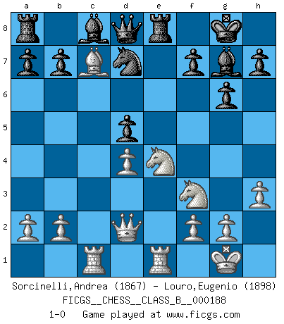 Last move : 1-0 2013 May 9 22:41:49 [Event "FICGS__CHESS__CLASS_B__000188"] [Site "FICGS"] [Date "2013.04.18"] [Round "1"] [White "Sorcinelli,Andrea"] [Black "Louro,Eugenio"] [Result "1-0"] [WhiteElo "1867"] [BlackElo "1898"] 1.d4 Nf6 2.Bg5 Ne4 3.Bf4 d5 4.e3 c6 5.Bd3 Nf6 6.h3 Nbd7 7.Nf3 e6 8.O-O g6 9.c4 dxc4 10.Bxc4 Nb6 11.Bd3 Bg7 12.Nbd2 O-O 13.Rc1 Re8 14.Re1 Nfd7 15.Ne4 e5 16.Bg5 Qc7 17.Bh4 exd4 18.exd4 Nd5 19.Qd2 Rf8 20.Bg3 Qb6 21.Bd6 Re8 22.Bc4 Qd8 23.Bxd5 cxd5 24.Bc7 1-0 Trompowsky attack (Ruth, Opovcensky Opening) Kingside Castling by player White (move 8) Kingside Castling by player Black (move 12) Player White won this chess game. Follow this game move after move (download)Daring ideas are like Chess men moved forward. They may be beaten, but they may start a winning game. (Johann Wolfgang von Goethe) Schach ist Krieg, im Schach geht es um testosterongesteuerte Urschreie. (Garry Kasparov) Yo he agregado estos principios a la ley: pongan los Caballos en acción antes de que los dos Alfiles sean desarrollados. (Emanuel Lasker) Ce n'est pas pour s'amuser qu'il joue aux échecs : il célèbre un culte. (Vladimir Nabokov) The smarter you play, the luckier you'll be. (Mark Pilarski)