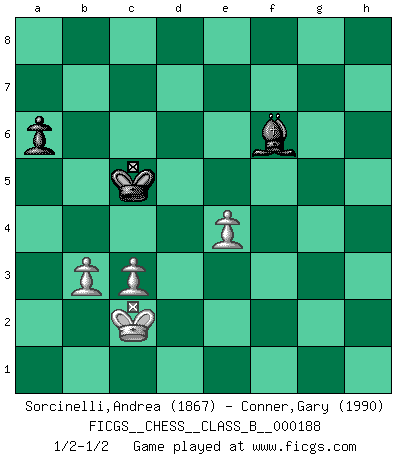 Last move : 1/2-1/2 2013 May 19 21:26:43 [Event "FICGS__CHESS__CLASS_B__000188"] [Site "FICGS"] [Date "2013.04.18"] [Round "1"] [White "Sorcinelli,Andrea"] [Black "Conner,Gary"] [Result "1/2-1/2"] [WhiteElo "1867"] [BlackElo "1990"] 1.d4 Nf6 2.Bg5 e6 3.e4 h6 4.Bxf6 Qxf6 5.Nf3 d6 6.Nc3 Nd7 7.Qd2 a6 8.O-O-O Qd8 9.h4 b5 10.Kb1 c5 11.g4 c4 12.g5 b4 13.Ne2 c3 14.bxc3 bxc3 15.Nxc3 hxg5 16.Nxg5 Rb8+ 17.Ka1 Qa5 18.Rh3 Be7 19.f4 Nb6 20.Rb1 e5 21.Rg3 Rxh4 22.fxe5 Rg4 23.Rxg4 Bxg4 24.Rb3 Rc8 25.Qf4 Rxc3 26.Qxf7+ Kd8 27.exd6 Bxd6 28.Ne6+ Bxe6 29.Qxe6 Kc7 30.Qf5 Bb4 31.Qf7+ Kb8 32.Kb1 Rxb3+ 33.axb3 Na8 34.Qg8+ Ka7 35.Qxg7+ Nc7 36.Qe5 Qxe5 37.dxe5 Bc3 38.Kc1 Kb6 39.Bc4 Bxe5 40.Kd2 Nb5 41.Bxb5 Kxb5 42.c3 Bf6 43.Kc2 Kc5 1/2-1/2 Trompowsky attack (Ruth, Opovcensky Opening) Queenside Castling by player White (move 8) 10 pieces endgame at move 37 : White KBPPPP , Black KBNP WHITE : King + 1 Bishop 4 Pawns BLACK : King + 1 Bishop 1 Knight 1 Pawn 9 pieces endgame at move 39 : White KBPPP , Black KBNP WHITE : King + 1 Bishop 3 Pawns BLACK : King + 1 Bishop 1 Knight 1 Pawn 8 pieces endgame at move 41 : White KBPPP , Black KBP WHITE : King + 1 Bishop 3 Pawns BLACK : King + 1 Bishop 1 Pawn 7 pieces endgame at move 41 : White KPPP , Black KBP WHITE : King + 3 Pawns BLACK : King + 1 Bishop 1 Pawn This chess game ended in a draw. Follow this game move after move (download)Pawn endings are to Chess what putting is to golf. (Cecil Purdy) Zeige mir drei Eröffnungsvarianten und ich beweise dir, dass zwei davon inkorrekt sind. (Emanuel Lasker) El Ajedrez es despiadado: debes de estar preparado para matar gente. (Nigel Short) Si le désir cupide (et stupide) de gagner est une inépuisable source de souffrance, une combinaison brillante sur l'échiquier est une découverte : le coquelicot qui s'épanouit lorsque apparaît la Voie Lactée. (Arrabal) Lottery : A tax on people who are bad at math. (Author unknown)