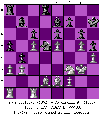 Last move : 1/2-1/2 2013 May 21 10:25:51 [Event "FICGS__CHESS__CLASS_B__000188"] [Site "FICGS"] [Date "2013.04.18"] [Round "1"] [White "Skwarczylo,Marek"] [Black "Sorcinelli,Andrea"] [Result "1/2-1/2"] [WhiteElo "1902"] [BlackElo "1867"] 1.d4 d5 2.c4 c6 3.e3 Nf6 4.Nc3 e6 5.Nf3 Nbd7 6.Qc2 Bd6 7.g4 h6 8.Bd2 dxc4 9.Bxc4 b5 10.Be2 Bb7 11.e4 Be7 12.e5 b4 13.Na4 Nd5 14.O-O h5 15.g5 O-O 16.Nc5 Nxc5 17.dxc5 a5 18.a3 g6 19.Rfc1 Qc7 20.Qe4 Rfb8 21.b3 Qd8 22.Nd4 Qd7 23.Bf1 Nc7 24.h4 Rd8 25.Nf3 Qd5 26.Qxd5 Nxd5 27.Kh2 Bf8 28.Kg3 Kh7 29.Be2 Be7 1/2-1/2 QGD Slav defense Kingside Castling by player White (move 14) Kingside Castling by player Black (move 15) This chess game ended in a draw. Follow this game move after move (download)Chess makes man wiser and clear-sighted. (Vladimir Putin) Smyslow ist ein Beweis dafür, dass ich noch zehn Jahre spielen kann! [der 75 jährige über den 85 jährigen] (Viktor Kortschnoi) Creo que una cierta cantidad de temperamento es esperada de los genios del Ajedrez. (Ron Gross) Shah mat. Le roi est mort. Cri de fierté d'un joueur venant de terrasser son adversaire, courtoisement, sans effusion de sang. You lose, general Kenobi. (General Grievous in Star Wars ep.3)