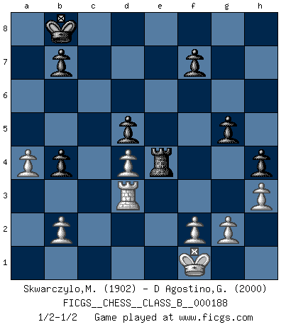Last move : 1/2-1/2 2013 June 14 19:0:59 [Event "FICGS__CHESS__CLASS_B__000188"] [Site "FICGS"] [Date "2013.04.18"] [Round "1"] [White "Skwarczylo,Marek"] [Black "D Agostino,Gabriele"] [Result "1/2-1/2"] [WhiteElo "1902"] [BlackElo "2000"] 1.d4 d5 2.c4 dxc4 3.e3 Be6 4.Nc3 Nf6 5.Nf3 h6 6.Ne5 Nbd7 7.Nxc4 c6 8.Be2 Bxc4 9.Bxc4 Qc7 10.O-O Nb6 11.Bd3 e5 12.Re1 O-O-O 13.a4 a5 14.Bd2 Kb8 15.Ne4 Nxe4 16.Bxe4 Nd5 17.Bc3 Bb4 18.Qb3 exd4 19.exd4 g5 20.Rad1 Qd6 21.Bd3 h5 22.Bc4 Rhe8 23.Bxb4 Qxb4 24.Rxe8 Rxe8 25.Qxb4 axb4 26.Kf1 Re4 27.Rd3 h4 28.Bxd5 cxd5 29.h3 1/2-1/2 Queen's gambit accepted Kingside Castling by player White (move 10) Queenside Castling by player Black (move 12) This chess game ended in a draw. Follow this game move after move (download)Different people feel differently about resigning. (Bobby Fischer) Das Zentrum ist der Balkan des Schachbretts - Kriegshandlungen können in jedem Moment ausbrechen. (Aaron Nimzowitsch) El Ajedrez es un expediente tonto que hace creer a la gente inactiva que hacen una cosa muy astuta cuando solamente estan perdiendo su tiempo. (George Bernard Shaw) Le moment que je préfère le plus dans une rencontre, c'est celui où je sens que la personnalité de l'adversaire se brise. (Robert Fischer) Follow your passion, and success will follow you. (Arthur Buddhold)