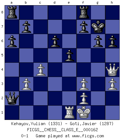 Last move : 0-1 2013 June 17 16:41:15 [Event "FICGS__CHESS__CLASS_E__000162"] [Site "FICGS"] [Date "2013.04.19"] [Round "1"] [White "Kehayov,Yulian"] [Black "Goti,Javier"] [Result "0-1"] [WhiteElo "1331"] [BlackElo "1287"] 1.e4 c5 2.c4 Nc6 3.Nf3 g6 4.d4 cxd4 5.Nxd4 Bg7 6.Nf3 d6 7.Bd3 Nf6 8.O-O Nb4 9.Bd2 Nxd3 10.Qc2 Nc5 11.Nc3 O-O 12.b3 Nfxe4 13.Nxe4 Bf5 14.Rfe1 Bxa1 15.Rxa1 Nxe4 16.Qb2 Nxd2 17.Qxd2 Bd7 18.Rd1 Qc7 19.h3 a6 20.Qg5 e5 21.Re1 Kg7 22.Qh4 Bc6 23.Ng5 h6 24.Nf3 Bxf3 25.gxf3 Qa5 26.Kf1 Qxa2 0-1 Sicilian defense Kingside Castling by player White (move 8) Kingside Castling by player Black (move 11) Player Black won this chess game. Follow this game move after move (download)An attack on the wing should be met by play in the center. (Nimzovitch) Frage: Wie viele Autos haben Sie schon zerstört? - Antwort: Nur zwei. (Loek van Wely) Repentinamente, me resultaba obvio en mi analisis que yo había pasado por alto lo que Fischer había visto en el tablero con la mas grande facilidad. (Mikhail Botvinnik) Il a essayé de se convaincre qu'il pourrait empêcher toutes les erreurs et ne jamais perdre. L'horreur ! Gary Kasparov au sujet de Robert Fischer. The age of a woman doesn't mean a thing. The best tunes are played on the oldest fiddles. (Ralph Waldo Emerson)
