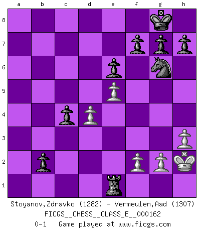 Last move : 0-1 2013 May 12 21:1:26 [Event "FICGS__CHESS__CLASS_E__000162"] [Site "FICGS"] [Date "2013.04.19"] [Round "1"] [White "Stoyanov,Zdravko"] [Black "Vermeulen,Aad"] [Result "0-1"] [WhiteElo "1282"] [BlackElo "1307"] 1.e4 e6 2.Nf3 d5 3.e5 c5 4.c3 Nc6 5.Bb5 Bd7 6.O-O a6 7.Bxc6 Bxc6 8.d3 Ne7 9.Re1 b5 10.h3 Ng6 11.d4 Be7 12.Be3 cxd4 13.cxd4 Rc8 14.a3 O-O 15.Nc3 Qd7 16.b4 Bb7 17.Qc1 Rc7 18.Qd2 Rfc8 19.Rac1 a5 20.bxa5 Bxa3 21.Rc2 b4 22.Nb1 Rxc2 23.Qd1 Qb5 24.Nfd2 Rc1 25.Nxa3 Qxa5 26.Nb3 Qxa3 27.Nxc1 Ba6 28.Nb3 Bc4 29.Nc5 b3 30.Qa1 Qa2 31.Qb1 Ra8 32.Nd7 b2 33.Bd2 Qxb1 34.Nb6 Qxe1+ 35.Bxe1 Ra1 36.Nxc4 Rxe1+ 37.Kh2 dxc4 0-1 French defense Kingside Castling by player White (move 6) Kingside Castling by player Black (move 14) Player Black won this chess game. Follow this game move after move (download)Alekhine is a poet who creates a work of art out of something that would hardly inspire another man to send home a picture post card. (Max Euwe) Bobby Fischer ist kein Vorbild für die heutige Jugend. (Viktor Kortschnoi) El Ajedrez demanda una total concentración. (Bobby Fischer) Tout change constamment, y compris dans le monde des Echecs. (Botvinnik) Better than a thousand days of diligent study is one day with a great teacher. (Japanese proverb)