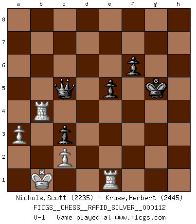 Last move : 0-1 2013 April 30 23:18:9 [Event "FICGS__CHESS__RAPID_SILVER__000112"] [Site "FICGS"] [Date "2013.04.19"] [Round "2"] [White "Nichols,Scott"] [Black "Kruse,Herbert"] [Result "0-1"] [WhiteElo "2235"] [BlackElo "2445"] 1.e4 c5 2.Nf3 d6 3.d4 cxd4 4.Nxd4 Nf6 5.Nc3 a6 6.Be3 e5 7.Nb3 Be6 8.f3 Be7 9.Qd2 O-O 10.O-O-O Nbd7 11.g4 b5 12.a3 Nb6 13.Kb1 Nc4 14.Bxc4 bxc4 15.Nc1 Rb8 16.g5 Ne8 17.Nd5 Bxd5 18.Qxd5 Qc8 19.Na2 Rb5 20.Qd2 Qb7 21.Qc1 Nc7 22.Nc3 Ra5 23.Ka1 Rb8 24.Bd2 Ne6 25.Rhf1 Nd4 26.Be3 Nb5 27.Bd2 Nxa3 28.bxa3 d5 29.Nb1 Rb5 30.exd5 Qd7 31.Ka2 Rxb1 32.Qxb1 Rxb1 33.Rxb1 h5 34.gxh6 Qxd5 35.Rb8+ Kh7 36.hxg7 Kxg7 37.Bb4 Bxb4 38.Rxb4 a5 39.Rb6 Qd4 40.Rb5 c3 41.Kb1 Qc4 42.Rg1+ Kf6 43.Rb3 Qd4 44.Rf1 Qe3 45.h4 Qe2 46.Rg1 Qxf3 47.h5 a4 48.Rb4 Qxh5 49.Re1 Qf3 50.Rxa4 Kf5 51.Rc4 f6 52.Rb4 Qf2 53.Rbe4 Qc5 54.Rb4 Kg5 0-1 Sicilian : Najdorf, Byrne (English) attack Kingside Castling by player Black (move 9) Queenside Castling by player White (move 10) 10 pieces endgame at move 50 : White KRRPP , Black KQPPP WHITE : King + 2 Rooks 2 Pawns BLACK : King + 1 Queen 3 Pawns Player Black won this chess game. Follow this game move after move (download)My God, Bobby Fischer plays so simply. (Alexei Suetin) Offensichtlich kennt Kasparow nichts anderes als Schach, und ich könnte 500 weitere Spieler dieser Sorte benennen. (Judith Polgar) El Ajedrez es una guerra en un tablero. El objetivo es aplastar la mente del oponente. (Bobby Fischer) Donnez-moi un Cavalier en 6e et je gagnerais toutes mes parties. (Steinitz) Luck never gives; it only lends. (Swedish proverb)
