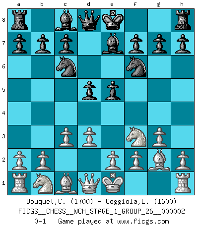 Last move : 0-1 2007 March 7 12:50:22 [Event "FICGS__CHESS__WCH_STAGE_1_GROUP_26__000002"] [Site "FICGS"] [Date "2007.01.30"] [Round "1"] [White "Bouquet,Cecile"] [Black "Coggiola,Leandro Damian"] [Result "0-1"] [WhiteElo "1700"] [BlackElo "1600"] 1.g3 e5 2.Bg2 d5 3.d3 Nf6 4.Nf3 Nc6 5.c3 Be7 0-1 This chess game has been lost on time (started : 2007.01.30 17:52:4) Benko's Opening Player Black won this chess game. Follow this game move after move (download)In a gambit you give up a Pawn for the sake of getting a lost game. (Samuel Standige Boden) Viele Opfer benötigen überhaupt keine konkrete Berechnung. Es genügt sich die entstehende Position kurz vorzustellen, um uns davon zu überzeugen, dass das Opfer korrekt ist. (Mikhail Nekhemyevich Tal) Mi estilo es algo parecido entre un poco de Tal y Petrosian. (Reshevsky) Il n'y a pas eu de défaite parce que je ne crois pas que cet ordinateur ait jamais existé. IBM a triché en refusant d'imprimer les modes de recherche de la machine. C'est évident, pendant le match, des coups décisifs ont été joués par des êtres humains. Aujourd'hui, les meilleurs spécialistes en informatique ne peuvent toujours pas expliquer comment Deep-Blue a pu jouer contre la logique des ordinateurs. IBM a gagné une guerre de communication, mais ils sont incapables de prouver que l'ordinateur a gagné tout seul. (Garry Kasparov) You cannot beat a roulette table unless you steal money from it. (Albert Einstein)