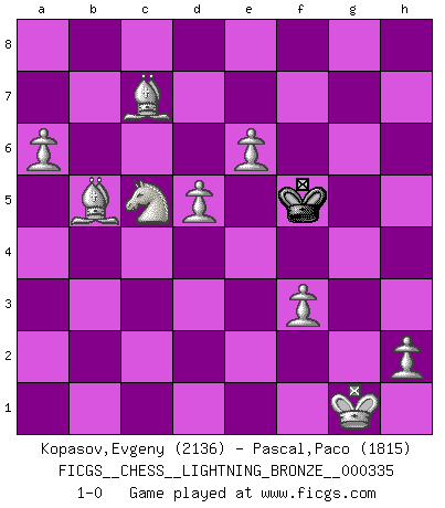 Last move : 1-0 2013 April 23 9:11:12 [Event "FICGS__CHESS__LIGHTNING_BRONZE__000335"] [Site "FICGS"] [Date "2013.04.23"] [Round "1"] [White "Kopasov,Evgeny"] [Black "Pascal,Paco"] [Result "1-0"] [WhiteElo "2136"] [BlackElo "1815"] 1.d4 d5 2.c4 Nf6 3.cxd5 Nxd5 4.Nf3 Nc6 5.e4 Ndb4 6.d5 e5 7.a3 Nd4 8.Nxd4 exd4 9.axb4 Bxb4+ 10.Bd2 a5 11.Bxb4 b6 12.Qxd4 c5 13.Qxg7 Rf8 14.Bc3 Qe7 15.Qe5 Bg4 16.Bb5+ Kd8 17.Qxe7+ Kxe7 18.f3 Bxf3 19.gxf3 Rg8 20.Kf2 h5 21.Nd2 Raf8 22.Rhg1 f5 23.Rxg8 Rxg8 24.Rg1 Rxg1 25.Kxg1 f4 26.e5 Kf7 27.e6+ Ke7 28.Be5 h4 29.Bxf4 h3 30.Bf1 Kf6 31.Bxh3 b5 32.Ne4+ Ke7 33.Bc7 a4 34.Nxc5 Ke8 35.Bf1 a3 36.bxa3 Kf8 37.Bxb5 Kg7 38.a4 Kf6 39.a5 Kf5 40.a6 1-0 QGD : Marshall defense 10 pieces endgame at move 37 : White KBBNPPPPP , Black K WHITE : King + 2 Bishops 1 Knight 5 Pawns BLACK : King + Player White won this chess game. Follow this game move after move (download)The Pawns are the soul of the game. (Francois Andre Danican Philidor) Sicherlich können nur Meister einen Stil haben. Daß ein nicht-Meister auch nur ein einziges Mal in seinem Leben eine Partie folgerecht durchführte, habe ich niemals bemerkt. (Emanuel Lasker) El Rey es una pieza de pelea. ¡Usenlo!. (Wilhelm Steinitz) Il (Jacob Murray) ne joue pas pour le bon coup, mais pour le meilleur. (Eloi Relange) Players are not good because they find tactics, it is about the way to find the positions in which those tactics are hidden. (Luc-Olivier Leclerc)