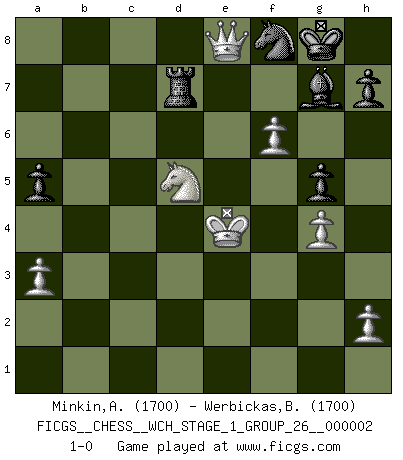 Last move : 1-0 2007 March 15 7:21:2 [Event "FICGS__CHESS__WCH_STAGE_1_GROUP_26__000002"] [Site "FICGS"] [Date "2007.01.30"] [Round "1"] [White "Minkin,Alexander"] [Black "Werbickas,Brian"] [Result "1-0"] [WhiteElo "1700"] [BlackElo "1700"] 1.d4 f5 2.g3 Nf6 3.Bg2 g6 4.Nf3 Bg7 5.O-O O-O 6.c4 d6 7.Nc3 c6 8.d5 Bd7 9.e4 fxe4 10.Ng5 Bg4 11.Qe1 cxd5 12.cxd5 Na6 13.Ncxe4 Qb6 14.Nc3 Nc5 15.Be3 Nfd7 16.Ne6 Bxe6 17.dxe6 Ne5 18.Qe2 Nc6 19.Rac1 Rac8 20.Rfd1 Qa5 21.Nd5 Qxa2 22.Rc2 Qb3 23.Ra1 Nxe6 24.Ra3 Qxa3 25.Nxe7+ Kh8 26.bxa3 Ncd4 27.Qg4 Rxc2 28.Bd5 Rf6 29.Ng8 Rf5 30.Bxe6 Nxe6 31.Qe4 Re2 32.Ne7 Rf6 33.Qc4 Re1+ 34.Kg2 a6 35.Qc8+ Nf8 36.Qe8 b5 37.Bd4 Re5 38.f4 Re2+ 39.Kf3 Re5 40.g4 g5 41.Bxe5 dxe5 42.f5 e4+ 43.Kxe4 a5 44.Qxb5 Rf7 45.Qe8 Rf6 46.Nd5 Rd6 47.Qe7 Rd7 48.f6 Kg8 49.Qe8 1-0 Dutch defense Kingside Castling by player White (move 5) Kingside Castling by player Black (move 5) Player White won this chess game. Follow this game move after move (download)If your opponent cannot do anything active, then don't rush the position; instead you should let him sit there, suffer, and beg you for a draw. (Jeremy Silman) Er war ein guter Schachspieler, aber ich kann Leute nicht ausstehen, die 'Heil Hitler' rufen (Über Alexander Aljechin). (Miguel Najdorf) No soy una persona materialista y por eso, no resiento la falta o pérdida del dinero. La ausencia de cosas mundanas carece de importancia. Ya que el Ajedrez es una forma en la que puedo ser tan materialista como yo desee sin tener la necesidad de vender mi alma. (Jamie Walter Adams) La guerre est enfant de la passion, la passion est enfant du narcissisme et le narcissisme est l'enfant. (...) Une autre partie ? (Thibault de Vassal) The project of the man are lower than those of the sky. (Chinese proverb)