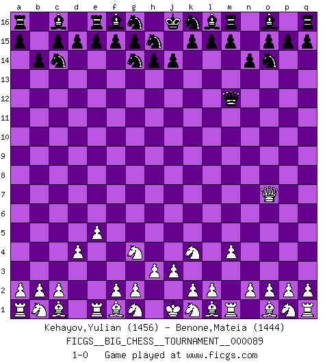 Last move : 1-0 2013 June 14 1:4:20 [Event "FICGS__BIG_CHESS__TOURNAMENT__000089"] [Site "FICGS"] [Date "2013.04.27"] [Round "1"] [White "Kehayov,Yulian"] [Black "Benone,Mateia"] [Result "1-0"] [WhiteElo "1456"] [BlackElo "1444"] 1.j2-k4 p16-o14 2.h2-g4 n15-n14 3.h1-o7 j15-g14 4.d2-d4 b16-c14 5.e2-e4 b15-b14 6.m2-m4 h16-m12 7.e4-e5 1-0 This big chess game has been lost on time (started : 2013.04.27 9:16:36) Follow this game move after move (download)Man is a frivolous, a specious creature, and like a Chess player, cares more for the process of attaining his goal than for the goal itself. (Dostoyevsky) Sehr viele beherrschen heutzutage das große Einmalseins des Schachspiels und kennen sogar dessen Logarithmentafeln auswendig - deshalb sollte man hin und wieder zu beweisen trachten, dass zwei mal zwei auch fünf sein kann. (Mikhail Nekhemyevich Tal) Si un gobernante no entiende al Ajedrez, ¿como puede governar él un reinado?. (El Rey Khusros II) On a dit que l'homme se distingue de l'animal par le fait qu'il achète plus de livres qu'il ne peut en lire. Je voudrais suggérer qu'inclure à la liste des livres quelques livres d'échecs rendrait la distinction manifeste. (Edward Lasker) I would love to change the world, but they won't give me the source code. (Unknown)