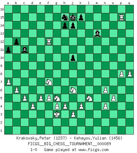 Last move : 1-0 2013 August 16 21:3:14 [Event "FICGS__BIG_CHESS__TOURNAMENT__000089"] [Site "FICGS"] [Date "2013.04.27"] [Round "1"] [White "Krakovsky,Peter"] [Black "Kehayov,Yulian"] [Result "1-0"] [WhiteElo "1237"] [BlackElo "1456"] 1.p2-p3 j15-k13 2.g2-g4 b16-c14 3.m2-m4 e15-e13 4.o1-p2 e13-e12 5.l1-o4 d15-d14 6.e2-e4 h15-g13 7.f2-f4 h16-l13 8.l2-l4 l13-l4 9.n2-n3 m15-m13 10.m1-l1 l4-f9 11.d2-d4 n15-n13 12.f4-f5 f16-e15 13.e4-e5 e15-f14 14.c2-c3 f14-e13 15.o4-p5 o16-h10 16.c1-l9 k16-h15 17.a2-a4 f9-g9 18.h1-d5 p16-o14 19.p1-o3 l16-o13 20.l1-l2 c16-k9 21.f1-b5 g16-j15 22.q1-l1 l15-l14 23.b1-d2 j15-h13 24.g1-f3 j16-j15 25.b5-k13 l14-k13 26.l9-n11 m13-m12 27.n11-p13 q15-q14 28.p13-l9 g13-j12 29.d5-o15 e16-l16 30.o15-p15 m16-p16 31.p15-o14 p16-o16 32.o14-n13 l16-m16 33.l9-h12 e13-g11 34.h12-m16 o16-m16 35.b2-b4 h10-j9 36.n13-n7 c14-e13 37.p5-o6 f15-f14 38.n7-b7 b15-b14 39.o3-n5 a15-a13 40.p2-e12 a16-b16 41.b7-c8 k9-g12 42.c8-c15 m16-c16 43.c15-d14 e13-c12 44.d14-d11 q16-h16 45.o6-q8 h15-k14 46.k1-l3 c12-b10 47.d11-b9 g9-b9 48.e12-b9 c16-c9 49.b9-e6 j12-l13 50.c3-c4 b16-c16 51.c4-c5 b14-b13 52.d2-c4 b13-b12 53.c4-d6 g12-h11 54.l3-j4 l13-k11 55.e6-k11 h11-j12 56.k11-j12 k13-j12 57.j2-k4 h16-d16 58.f3-g5 d16-d8 59.j1-h1 d8-q8 60.q2-q4 c16-c10 61.h2-k3 q8-o8 62.h1-h2 b10-c8 63.g5-e4 c8-d6 64.e4-d6 c9-b9 65.b4-b5 q14-q13 66.a4-a5 j9-h10 67.o2-o4 c10-a10 68.a5-a6 o8-p8 69.l1-p1 q13-q12 70.b5-b6 b9-a9 71.a6-a7 h10-n5 72.m4-n5 a9-h9 73.h3-h4 q12-q11 74.p3-p4 q11-q10 75.q4-q5 q10-q9 76.p4-p5 m12-m11 77.e1-m1 a10-a9 78.m1-m10 a9-e9 79.a1-m1 p8-p11 80.l2-m2 h9-h11 81.h2-g3 g11-f12 82.m10-m9 h13-k12 83.m9-e9 p11-q11 84.m2-m9 a13-a12 85.m9-q9 q11-q9 86.e9-q9 o13-n12 87.q9-q12 n12-m13 88.q12-k12 h11-k11 89.k12-k11 m13-k11 90.q5-q6 f12-e11 91.k3-l5 k11-q5 92.m1-m11 e11-d12 93.m11-g11 d12-c11 94.k4-j6 q5-m9 95.g11-g15 k14-h15 96.p1-m1 m9-k11 97.k2-k4 a12-a11 98.n3-n4 k11-l10 99.n5-n6 l10-q5 100.m1-m15 q5-k11 101.o4-o5 k11-l12 102.p5-p6 l12-k13 103.m15-p15 k13-l14 104.d6-f7 f14-f13 105.g15-f15 l14-m13 106.j4-g5 f13-f12 107.f15-f12 j12-j11 108.q6-q7 j11-j10 109.q7-q8 j15-h16 110.p6-p7 h16-j15 111.p7-p8 1-0 Follow this game move after move (download)Bobby is the finest Chess player this country ever produced. His memory for the moves, his brilliance in dreaming up combinations, and his fierce determination to win are uncanny. (John Collins) Die Fehler sind da, Sie warten nur darauf gemacht zu werden. (Savielly Grigorievitsch Tartakower) No puedes jugar al Ajedrez si eres de corazón noble. (Proverbio Francés) Plusieurs personnes se sont demandées comment Tal faisait pour gagner... En fait, c'est très simple ! Il met ses pièces au centre de l'échiquier et les sacrifie quelque part ! (David Bronstein) Cactus - It is depressed cucumber. (Ilmars Cirulis)