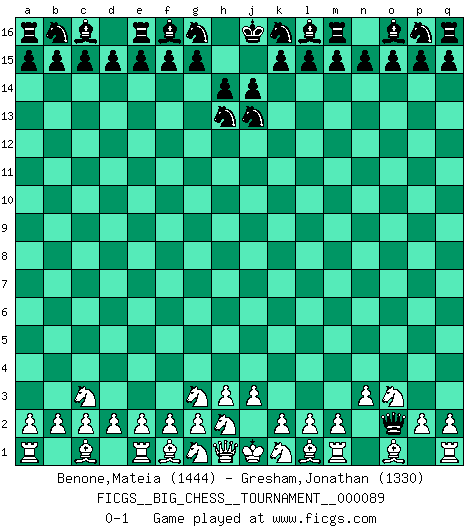 Last move : 0-1 2013 June 13 12:59:45 [Event "FICGS__BIG_CHESS__TOURNAMENT__000089"] [Site "FICGS"] [Date "2013.04.27"] [Round "1"] [White "Benone,Mateia"] [Black "Gresham,Jonathan"] [Result "0-1"] [WhiteElo "1444"] [BlackElo "1330"] 1.b1-c3 j15-h13 2.n2-n3 h16-o10 3.j2-g3 o10-o2 4.p1-o3 h15-j13 0-1 This big chess game has been lost on time (started : 2013.04.27 9:16:36) Follow this game move after move (download)There is only one thing Fischer does in Chess without pleasure: to lose ! (Boris Spassky) Zum Sieg gelangt man nicht, wenn man gut, sondern nur wenn man besser spielt (Savielly Grigorievitsch Tartakower) Un jugador que trata de regresar una movida en el Ajedrez es un futuro carterista. (Richard Fenton) Votre seul travail dans les ouvertures est d'obtenir un milieu de partie jouable. (Lajos Portish) A cynic is a man who knows the price of everything but the value of nothing. (Oscar Wilde)