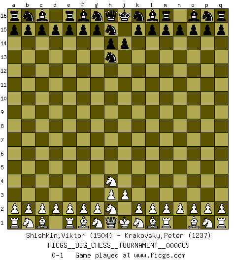 Last move : 0-1 2013 May 28 23:49:36 [Event "FICGS__BIG_CHESS__TOURNAMENT__000089"] [Site "FICGS"] [Date "2013.04.27"] [Round "1"] [White "Shishkin,Viktor"] [Black "Krakovsky,Peter"] [Result "0-1"] [WhiteElo "1504"] [BlackElo "1237"] 1.j2-h4 j15-h13 0-1 This big chess game has been lost on time (started : 2013.04.27 9:16:36) Follow this game move after move (download)Chess is above all, a fight ! (Emanuel Lasker) Woher wissen wir, daß der Neanderthaler Blindschach gespielt hat? -- Bei Ausgrabungen wurden keine Schachbretter und Figuren gefunden. (Anonymous) Una buena ofensiva y una buena defensa, comienzan ambas con un buen desarrollo. (Bruce A. Moon) Ce qui caractérise les parties de combat, c'est que si le défenseur a constamment de difficiles problèmes à résoudre, l'attaquant doit chercher sans relâche de nouvelles possibilités d'attaque. (Koblentz) Industry executives and analysts often mistakenly talk about strategy as if it were some kind of chess match. But in chess, you have just two opponents, each with identical resources, and with luck playing a minimal role. The real world is much more like a poker game, with multiple players trying to make the best of whatever hand fortune has dealt them. In our industry, Bill Gates owns the table until someone proves otherwise. (David Moschella, 'Computerworld')