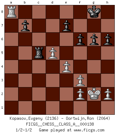 Last move : 1/2-1/2 2013 August 12 13:49:38 [Event "FICGS__CHESS__CLASS_A__000138"] [Site "FICGS"] [Date "2013.04.27"] [Round "1"] [White "Kopasov,Evgeny"] [Black "Oortwijn,Ron"] [Result "1/2-1/2"] [WhiteElo "2136"] [BlackElo "2064"] 1.d4 Nf6 2.c4 g6 3.Nc3 d5 4.cxd5 Nxd5 5.e4 Nxc3 6.bxc3 Bg7 7.Nf3 c5 8.Rb1 O-O 9.Be2 cxd4 10.cxd4 Qa5+ 11.Bd2 Qxa2 12.O-O Bg4 13.Bg5 h6 14.Be3 Nc6 15.d5 Bxf3 16.gxf3 Nd4 17.Bxd4 Bxd4 18.Qxd4 Qxe2 19.Kg2 Qa6 20.Rfc1 Rfc8 21.Rxc8+ Rxc8 22.Ra1 Qb5 23.Rxa7 f6 24.Qa4 Qxa4 25.Rxa4 Rc5 26.Ra8+ 1/2-1/2 King's Indian defense, 3.Nc3 Kingside Castling by player Black (move 8) Kingside Castling by player White (move 12) This chess game ended in a draw. Follow this game move after move (download)Robert Fischer is a law unto himself. (Larry Evans) Woher wissen wir, daß der Neanderthaler Blindschach gespielt hat? -- Bei Ausgrabungen wurden keine Schachbretter und Figuren gefunden. (Anonymous) Nunca nadie ha ganado una partida de Ajedrez rindiendose. (Unknown) Les ravages du H expliquent la différence de niveau entre Tal et Thal [Abergel]. I'm extremely disappointed. I send you out for exciting, new designer drugs, you come back with tomato sauce. (Gregory House, House M.D.)