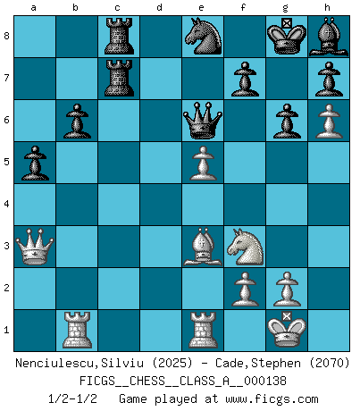 Last move : 1/2-1/2 2013 June 16 16:45:23 [Event "FICGS__CHESS__CLASS_A__000138"] [Site "FICGS"] [Date "2013.04.27"] [Round "1"] [White "Nenciulescu,Silviu"] [Black "Cade,Stephen"] [Result "1/2-1/2"] [WhiteElo "2025"] [BlackElo "2070"] 1.d4 Nf6 2.c4 g6 3.Nc3 d5 4.cxd5 Nxd5 5.e4 Nxc3 6.bxc3 Bg7 7.Nf3 c5 8.Rb1 O-O 9.Be2 cxd4 10.cxd4 Qa5+ 11.Bd2 Qxa2 12.O-O b6 13.Qc1 Qe6 14.Re1 Ba6 15.Bxa6 Nxa6 16.h4 Qd7 17.h5 Rfc8 18.Qa3 Nc7 19.d5 Ne8 20.h6 Bh8 21.Bg5 e6 22.dxe6 Qxe6 23.e5 Rc7 24.Rbd1 Rac8 25.Be3 a5 26.Rb1 1/2-1/2 King's Indian defense, 3.Nc3 Kingside Castling by player Black (move 8) Kingside Castling by player White (move 12) This chess game ended in a draw. Follow this game move after move (download)Do you realize Fischer almost never has any bad pieces? He exchanges them, and the bad pieces remain with his opponents. (Yuri Balashov) Die Elozahlen sind sehr schlecht für das Schach. Jetzt ist Schach eine Sportindustrie, die darauf zielt Elopunkte zu machen. (Miguel Najdorf) Debemos de asegurarnos de que el Ajedrez no se convierta en un lenguaje muerto, muy interesante, pero solo para un grupo muy pequeño. (Sytze Faber) On n'a jamais que l'âge auquel on a commence à jouer aux échecs car après on cesse de vieillir. (Capablanca) A journey of a thousand sites begins with a single click. (Author unknown)
