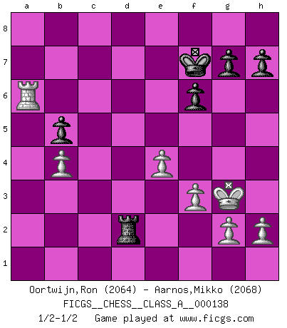 Last move : 1/2-1/2 2013 September 12 16:36:0 [Event "FICGS__CHESS__CLASS_A__000138"] [Site "FICGS"] [Date "2013.04.27"] [Round "1"] [White "Oortwijn,Ron"] [Black "Aarnos,Mikko"] [Result "1/2-1/2"] [WhiteElo "2064"] [BlackElo "2068"] 1.e4 e5 2.Nf3 Nc6 3.Bb5 a6 4.Bxc6 dxc6 5.O-O f6 6.d4 exd4 7.Nxd4 c5 8.Nb3 Qxd1 9.Rxd1 Bg4 10.f3 Be6 11.Nc3 Bd6 12.Be3 b6 13.a4 Kf7 14.a5 c4 15.Nd4 b5 16.Nxe6 Kxe6 17.b3 cxb3 18.cxb3 Ne7 19.Rac1 Ba3 20.Rc2 Rad8 21.Rb1 Bb4 22.Ne2 Rd7 23.Nd4+ Kf7 24.Nc6 Nxc6 25.Rxc6 Bxa5 26.b4 Bb6 27.Bxb6 cxb6 28.Rxb6 Rhd8 29.Rxa6 Rd1+ 30.Rxd1 Rxd1+ 31.Kf2 Rd2+ 32.Kg3 1/2-1/2 Ruy Lopez : Exchange, Gligoric variation Kingside Castling by player White (move 5) This chess game ended in a draw. Follow this game move after move (download)A player surprised is half beaten. (Proverb) Jeder Schachmeister war einmal ein Anfänger. (Irving Chernev) El poder defensivo de una pieza clavada, solamente es imaginario. (Aaron Nimzovich) La menace est plus forte que l'exécution. (Aaron Nimzovitch) Those parts of the system that you can hit with a hammer (not advised) are called hardware; those program instructions that you can only curse at are called software. (Anonymous)