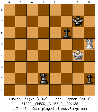 Last move : 1/2-1/2 2013 September 11 22:22:6 [Event "FICGS__CHESS__CLASS_A__000138"] [Site "FICGS"] [Date "2013.04.27"] [Round "1"] [White "Kuster,Zeljko"] [Black "Cade,Stephen"] [Result "1/2-1/2"] [WhiteElo "2162"] [BlackElo "2070"] 1.d4 Nf6 2.Nf3 g6 3.c4 Bg7 4.g3 d5 5.Bg2 dxc4 6.Na3 c3 7.bxc3 c5 8.O-O O-O 9.e3 Nc6 10.Qe2 Bf5 11.Rd1 Qb6 12.Nd2 cxd4 13.cxd4 Rac8 14.Nb3 Na5 15.e4 Bg4 16.f3 Nxb3 17.axb3 Be6 18.Nc4 Qxb3 19.Na5 Qb4 20.Be3 b6 21.Rdb1 Qd6 22.Nb3 Rc3 23.Nd2 Rxe3 24.Qxe3 Ng4 25.e5 Nxe3 26.exd6 exd6 27.Rxa7 Bxd4 28.Nb3 Bxb3 29.Rxb3 Rc8 30.Ra2 Nd5 31.Kf1 Rc1+ 32.Ke2 Nc3+ 33.Kd3 Nxa2 34.Kxd4 Rc2 35.Bf1 Rxh2 36.Rxb6 d5 37.Ba6 Rd2+ 38.Ke3 Rd1 39.Be2 Rc1 40.Kd2 Rc7 41.g4 Kg7 42.Bd3 h6 43.f4 Nc3 44.f5 gxf5 45.Bxf5 Rc4 46.Rd6 Rc5 47.Kd3 Nd1 48.Kd4 Rc4+ 49.Kxd5 Ne3+ 50.Ke5 Nxg4+ 51.Bxg4 Rxg4 52.Kf5 h5 53.Rd7 Rg3 54.Kf4 h4 55.Rc7 Rg6 56.Kf3 h3 57.Rc2 Rg2 58.Rc5 Rd2 59.Kg4 h2 60.Rh5 f6 1/2-1/2 King's Indian : East Indian defense Kingside Castling by player White (move 8) Kingside Castling by player Black (move 8) 10 pieces endgame at move 45 : White KRBP , Black KRNPPP WHITE : King + 1 Rook 1 Bishop 1 Pawn BLACK : King + 1 Rook 1 Knight 3 Pawns 9 pieces endgame at move 49 : White KRBP , Black KRNPP WHITE : King + 1 Rook 1 Bishop 1 Pawn BLACK : King + 1 Rook 1 Knight 2 Pawns 8 pieces endgame at move 50 : White KRB , Black KRNPP WHITE : King + 1 Rook 1 Bishop BLACK : King + 1 Rook 1 Knight 2 Pawns 7 pieces endgame at move 51 : White KRB , Black KRPP WHITE : King + 1 Rook 1 Bishop BLACK : King + 1 Rook 2 Pawns 6 pieces endgame at move 51 : White KR , Black KRPP WHITE : King + 1 Rook BLACK : King + 1 Rook 2 Pawns This chess game ended in a draw. Follow this game move after move (download)A win by an unsound combination, however showy, fills me with artistic horror. (Wilhelm Steinitz) Wenn Dein Gegner dir ein Remis anbietet, versuch herauszufinden, weshalb er glaubt schlechter zu stehen. (Nigel Short) El Ajedrez es tan inspirador que yo no creo que un buen jugador sea capaz de tener un pensamiento malo durante una partida. (Wilhelm Steinitz) Le joueur d'Echecs qui veut atteindre le top est obligé de développer son propre credo créatif. Alexeï Stepanovicth Souétine. Il est facile d'écrire des livres ! Ce qui est difficile, c'est de jouer ! (Alexeï Stepanovicth Souétine) Programming can only do so much before it becomes too much. (Don Groves)