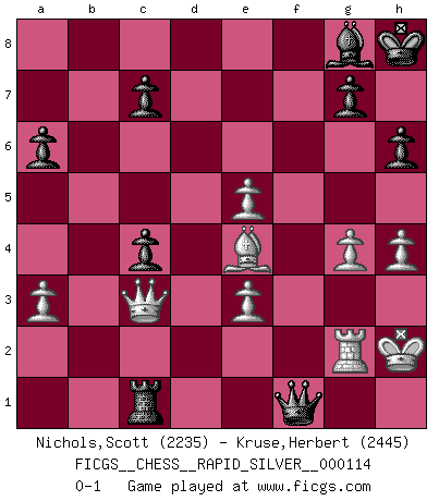 Last move : 0-1 2013 May 15 2:31:21 [Event "FICGS__CHESS__RAPID_SILVER__000114"] [Site "FICGS"] [Date "2013.04.30"] [Round "1"] [White "Nichols,Scott"] [Black "Kruse,Herbert"] [Result "0-1"] [WhiteElo "2235"] [BlackElo "2445"] 1.c4 e5 2.Nc3 Nf6 3.Nf3 Nc6 4.g3 Bb4 5.Bg2 O-O 6.O-O d6 7.d3 h6 8.Na4 a5 9.b3 Re8 10.Bb2 Bg4 11.h3 Bf5 12.Kh2 Bh7 13.Nd2 Qd7 14.Ne4 Nxe4 15.dxe4 Qe7 16.a3 Bc5 17.e3 Nb8 18.Nxc5 dxc5 19.Rb1 Nc6 20.Qc2 f6 21.Rfd1 Bg6 22.Rd2 Red8 23.Rbd1 Bh5 24.f3 Rxd2 25.Rxd2 a4 26.bxa4 Be8 27.f4 Nd8 28.a5 Nf7 29.fxe5 fxe5 30.Qc3 Bc6 31.Rf2 Re8 32.Rf5 Bd7 33.Rf2 Nd6 34.a6 bxa6 35.Qa5 Nxc4 36.Qc3 Be6 37.Bf1 Nxb2 38.Rxb2 Qd6 39.Rd2 Qc6 40.h4 Kh8 41.Rf2 c4 42.Qxe5 Bg8 43.Qc3 Qb5 44.Rb2 Qa4 45.Bg2 Rd8 46.Rb7 Qc6 47.e5 Qc5 48.Be4 Qf8 49.Rb2 Qf1 50.Rg2 Rd1 51.g4 Rc1 0-1 English Opening Kingside Castling by player Black (move 5) Kingside Castling by player White (move 6) Player Black won this chess game. Follow this game move after move (download)Chess is played with the mind and not with the hands ! (Renaud and Kahn) Wer mein Gambit spielt, muß bereit sein, alle Brücken hinter sich abzubrechen. Es verändert den ganzen Menschen. Es wirkt wie ein Zauberstab und fördert verkümmerte, gute Charakter- eigenschaften wieder zu Tage. (Emil Joseph Diemer) Yo considero que Fischer es uno de los expertos mas grandes de aperturas de siempre. (Keith Hayward) Il n'y a pas eu de défaite parce que je ne crois pas que cet ordinateur ait jamais existé. IBM a triché en refusant d'imprimer les modes de recherche de la machine. C'est évident, pendant le match, des coups décisifs ont été joués par des êtres humains. Aujourd'hui, les meilleurs spécialistes en informatique ne peuvent toujours pas expliquer comment Deep-Blue a pu jouer contre la logique des ordinateurs. IBM a gagné une guerre de communication, mais ils sont incapables de prouver que l'ordinateur a gagné tout seul. (Garry Kasparov) Horse racing is animated roulette. (Roger Kahn)