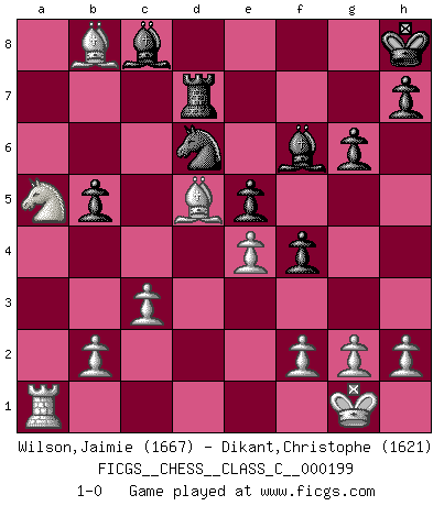 Last move : 1-0 2013 October 11 17:20:5 [Event "FICGS__CHESS__CLASS_C__000199"] [Site "FICGS"] [Date "2013.04.30"] [Round "1"] [White "Wilson,Jaimie"] [Black "Dikant,Christophe"] [Result "1-0"] [WhiteElo "1667"] [BlackElo "1621"] 1.e4 g6 2.d4 Bg7 3.Nf3 c6 4.c3 d6 5.Bd3 e5 6.O-O Nd7 7.Nbd2 Qc7 8.Bc2 Ngf6 9.Nc4 O-O 10.dxe5 dxe5 11.Qd6 Qxd6 12.Nxd6 Ne8 13.Nc4 f6 14.Be3 b5 15.Na5 c5 16.a4 a6 17.axb5 axb5 18.Bb3+ c4 19.Nxc4 Rxa1 20.Na5 Kh8 21.Rxa1 Nd6 22.Bd5 f5 23.Ng5 f4 24.Ba7 Bf6 25.Ne6 Rf7 26.Nc5 Rg7 27.Nxd7 Rxd7 28.Bb8 1-0 Robatsch (Modern) defense Kingside Castling by player White (move 6) Kingside Castling by player Black (move 9) Player White won this chess game. Follow this game move after move (download)Chess demands total concentration. (Bobby Fischer) Als ich elf wurde, wurde ich einfach gut. (Robert James Fischer) La última cosa en que Fischer estaba interesado era en tonterías, siempre y cuando el Ajedrez estuviera involucrado. (Elie Agur) J'ai toujours senti une vague pitié pour l'homme qui ne connaît rien aux échecs, tout comme j'en aurais pour un homme ignorant de l'amour. Les Echecs, comme la musique ou comme l'amour, ont le pouvoir de rendre heureux. (Siegbert Tarrasch) Memory is a way of holding onto the things you love, the things you are, the things you never want to lose. (from the television show: The Wonder Years)