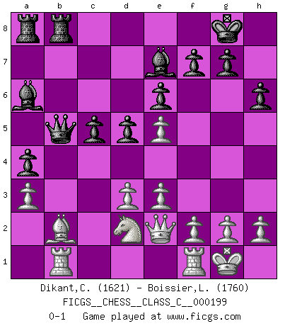 Last move : 0-1 2013 June 29 9:49:6 [Event "FICGS__CHESS__CLASS_C__000199"] [Site "FICGS"] [Date "2013.04.30"] [Round "1"] [White "Dikant,Christophe"] [Black "Boissier,Lucien"] [Result "0-1"] [WhiteElo "1621"] [BlackElo "1760"] 1.d4 Nf6 2.Nf3 e6 3.e3 b6 4.Bd3 Bb7 5.Nbd2 Be7 6.b3 O-O 7.Bb2 Nc6 8.a3 a5 9.Qe2 d6 10.O-O d5 11.Ne5 Nxe5 12.dxe5 Nd7 13.Qh5 h6 14.Nf3 Nc5 15.Rac1 Nxd3 16.cxd3 a4 17.b4 c5 18.bxc5 bxc5 19.Qg4 Qb6 20.Rb1 Rfb8 21.Nd2 Ba6 22.Qe2 Qb5 0-1 Queen's pawn : Yusupov-Rubinstein system Kingside Castling by player Black (move 6) Kingside Castling by player White (move 10) Player Black won this chess game. Follow this game move after move (download)The boy (then a 12 year old boy named Anatoly Karpov) doesn't have a clue about Chess, and there's no future at all for him in this profession. (Mikhail Botvinnik) Bis jetzt ist Weiß einer wohlbekannten Analyse gefolgt. Aber jetzt begeht er einen schrecklichen Fehler: Er beginnt seinen eigenen Kopf zu benutzen. (Siegbert Tarrasch) Tu eres para mi la Reina en d8 y yo soy el Peón en d7!!. (GM Eduard Gufeld) Votre prénom est 'Tactique', votre deuxième prénom est 'Tactique' et votre nom est 'Tactique'. (Ken Smith) When I took office, only high energy physicists had ever heard of what is called the World Wide Web... Now even my cat has its own page. (Bill Clinton, 1996)