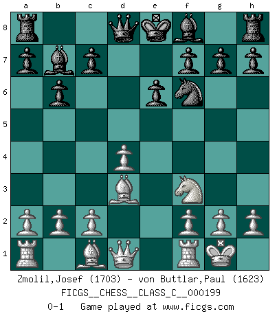 Last move : 0-1 2013 June 26 1:6:2 [Event "FICGS__CHESS__CLASS_C__000199"] [Site "FICGS"] [Date "2013.04.30"] [Round "1"] [White "Zmolil,Josef"] [Black "von Buttlar,Paul"] [Result "0-1"] [WhiteElo "1703"] [BlackElo "1623"] 1.e4 e6 2.d4 d5 3.Nc3 dxe4 4.Nxe4 Nd7 5.Nf3 Ngf6 6.Nxf6+ Nxf6 7.Bd3 b6 8.O-O Bb7 0-1 This chess game has been lost on time (started : 2013.04.30 16:39:41) French : Rubinstein variation Kingside Castling by player White (move 8) Player Black won this chess game. Follow this game move after move (download)By playing at Chess then, we may learn: First: Foresight... Second: Circumspection... Third: Caution... And lastly, we learn by Chess the habit of not being discouraged by present bad appearances in the state of our affairs, the habit of hoping for a favorable chance, and that of persevering in the secrets of resources. (Benjamin Franklin) Schach ist die gewalttätigste aller Sportarten. (Garry Kasparov) Si tu oponente te ofrece un empate, trata de averiguar porque piensa él que esta en una posición peor. (Nigel Short) La victoire dans une partie d'Echecs appartient la plupart du temps à celui qui voit un peu plus loin que l'adversaire. (Lasker) Fear is the path to the dark side. Fear leads to anger; anger leads to hate; hate leads to suffering. I sense much fear in you. (Master Yoda in Star Wars ep.1)