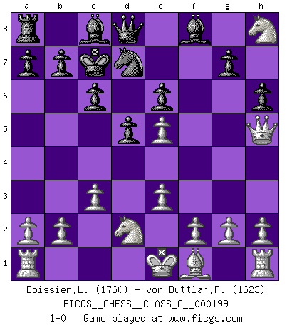 Last move : 1-0 2013 June 22 17:35:15 [Event "FICGS__CHESS__CLASS_C__000199"] [Site "FICGS"] [Date "2013.04.30"] [Round "1"] [White "Boissier,Lucien"] [Black "von Buttlar,Paul"] [Result "1-0"] [WhiteElo "1760"] [BlackElo "1623"] 1.d4 d5 2.Nf3 c6 3.c3 Nf6 4.Bg5 e6 5.Nbd2 Nbd7 6.e3 h6 7.Bf4 Nh5 8.Be5 f6 9.Nh4 fxe5 10.Qxh5+ Ke7 11.Ng6+ Kd6 12.dxe5+ Kc7 13.Nxh8 1-0 Queen's pawn game Player White won this chess game. Follow this game move after move (download)Chess is everything: art, science and sport. (Anatoly Karpov) Im Leben werden Partien nie so unstrittig gewonnen wie im Spiel (Emanuel Lasker) No es tiempo de jugar al Ajedrez cuando la casa esta en llamas. (Proverbio Italiano) La menace est plus forte que l'exécution. (Aaron Nimzovitch) When it is a question of money, everybody is of the same religion. (Voltaire)