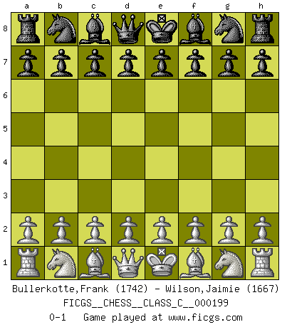 Last move : 0-1 2013 June 10 0:42:55 [Event "FICGS__CHESS__CLASS_C__000199"] [Site "FICGS"] [Date "2013.04.30"] [Round "1"] [White "Bullerkotte,Frank"] [Black "Wilson,Jaimie"] [Result "0-1"] [WhiteElo "1742"] [BlackElo "1667"] 0-1 This chess game has been lost on time (started : 2013.04.30 16:39:41) Player Black won this chess game. Follow this game move after move (download)When you are lonely, when you feel yourself an alien in the world, play Chess. This will raise your spirits and be your counselor in war. (Aristotle) Schach ist Leben. (Robert James Fischer) Bobby solo arroja las piezas y solas caen en las casillas correctas. (Miguel Najdorf ) Mais n'est-ce pas déjà le limiter injurieusement que d'appeler les échecs un jeu? N'est-ce pas aussi une science, un art, ou quelque chose qui, comme le cercueil de Mahomet entre ciel et terre, est suspendu entre l'un et l'autre, et qui réunit un nombre incroyable de contraires ? (Stefan Zweig) Computers are like Old Testament gods; lots of rules and no mercy. (Joseph Campbell)