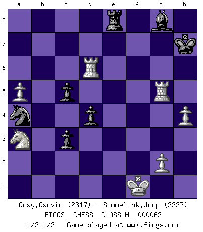 Last move : 1/2-1/2 2013 July 20 11:53:48 [Event "FICGS__CHESS__CLASS_M__000062"] [Site "FICGS"] [Date "2013.05.01"] [Round "1"] [White "Gray,Garvin"] [Black "Simmelink,Joop"] [Result "1/2-1/2"] [WhiteElo "2317"] [BlackElo "2227"] 1.d4 d5 2.c4 c6 3.Nf3 Nf6 4.Nc3 e6 5.Bg5 h6 6.Bh4 dxc4 7.e4 g5 8.Bg3 b5 9.Be2 Bb7 10.Ne5 Bg7 11.h4 Qe7 12.Bf3 Nfd7 13.Nxd7 Nxd7 14.e5 g4 15.Bxg4 Rd8 16.Qe2 c5 17.Nxb5 O-O 18.d5 exd5 19.f4 Nb6 20.O-O Bc6 21.a4 a6 22.Na3 f6 23.a5 Na4 24.Bf3 fxe5 25.fxe5 Qe6 26.Bg4 Qg6 27.e6 h5 28.e7 Qxg4 29.Qxg4 hxg4 30.Rf4 Rde8 31.exf8Q+ Rxf8 32.Rxg4 Kh7 33.Re1 Re8 34.Rf1 Bd7 35.Rg5 Be6 36.Rf3 Bxb2 37.Be5 Bd4+ 38.Kf1 Bg8 39.Bf6 Bxf6 40.Rxf6 c3 41.Rxa6 d4 42.Rd6 1/2-1/2 QGD Slav : 4.Nc3 Kingside Castling by player Black (move 17) Kingside Castling by player White (move 20) Promotion Queen by player White (move 31) This chess game ended in a draw. Follow this game move after move (download)When you don't know what to play, wait for an idea to come into your opponent's mind. You may be sure that idea will be wrong. (Siegbert Tarrasch) Ich hatte Angst gegen einen russischen Großmeister zu verlieren, und er befürchtete gegen einen kleinen Jungen zu verlieren. (über ein Remis gegen Juri Awerbach). (Robert James Fischer) Aunque la mayoría de la gente disfruta observar las partidas de los grandes Maestros de ataque, algunos de los jugadores mas notables en la historia han sido los jugadores silenciosos posicionales. Lentamente ellos te aplastan despojandote de tu espacio, congestionando tus piezas y dejandote virtualmente sin nada que hacer. (Yasser Seirawan) Les réformistes prétendent que les progrès de la théorie conduiront à la disparition des échecs, et qu'il faut, pour leur rendre vie, en remanier les règles. En réalité, qu'exprime cette affirmation? Le mépris de l'intuition, de l'imagination et de tous les autres éléments qui font des échecs un art. (Alexander Alekhine) There will be no order, only chaos. (Sol Robeson in Pi by Darren Aronofsky)