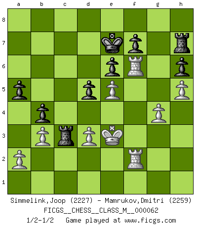 Last move : 1/2-1/2 2013 May 14 18:29:27 [Event "FICGS__CHESS__CLASS_M__000062"] [Site "FICGS"] [Date "2013.05.01"] [Round "1"] [White "Simmelink,Joop"] [Black "Mamrukov,Dmitri"] [Result "1/2-1/2"] [WhiteElo "2227"] [BlackElo "2259"] 1.e4 e6 2.d4 d5 3.Nc3 Nf6 4.Bg5 Be7 5.e5 Nfd7 6.h4 h6 7.Bxe7 Qxe7 8.f4 a6 9.Qd2 c5 10.Nf3 b5 11.g4 Nc6 12.O-O-O Nb6 13.dxc5 Qxc5 14.Nd4 Qxd4 15.Qxd4 Nxd4 16.Rxd4 Ke7 17.Rh3 Bd7 18.h5 Rab8 19.b3 Nc8 20.Ne2 Na7 21.Rd1 Nc6 22.Nd4 Nxd4 23.Rxd4 a5 24.Bd3 b4 25.f5 Bb5 26.Kd2 Rhc8 27.Rf3 Rc7 28.f6+ gxf6 29.Rxf6 Bxd3 30.cxd3 Rh8 31.Rdf4 Rh7 32.Ke3 Rc1 33.Rf1 Rc5 34.R1f2 Rc3 1/2-1/2 French : Albin-Alekhine-Chatard attack Queenside Castling by player White (move 12) This chess game ended in a draw. Follow this game move after move (download)Examine moves that smite! A good eye for smites is far more important than a knowledge of strategical principles. (Purdy) Ja, ich habe einmal eine Blitzpartie gespielt, es war in einem Zug, 1929. --im Interview 1989 (Mikhail Moiseyevich Botvinik) El Ajedrez te enseña a controlarl la excitación inicial que sientes cuando vez algo que parece bueno y te enseña a pensar objetivamente cuando te encuentras en problemas. (Stanley Kubrick) Les échecs, c'est l'art d'analyser. (Mikhail Botvinnik) The existence of forgetting has never been proved: We only know that some things don't come to mind when we want them. (Friedrich Nietzsche)