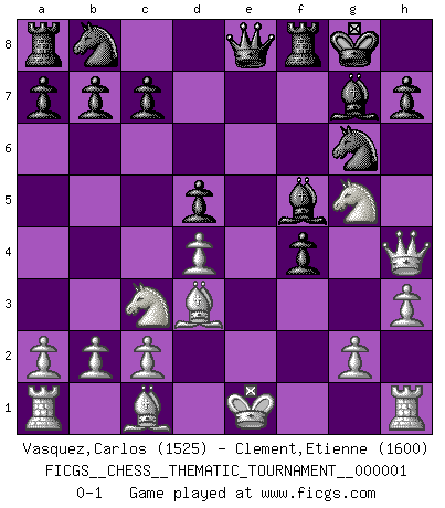 Last move : 0-1 2006 June 11 11:58:9 [Event "FICGS__CHESS__THEMATIC_TOURNAMENT__000001"] [Site "FICGS"] [Date "2006.05.19"] [Round "1"] [White "Vasquez,Carlos"] [Black "Clement,Etienne"] [Result "0-1"] [WhiteElo "1525"] [BlackElo "1600"] 1.e4 e5 2.f4 exf4 3.Nf3 g5 4.h3 f5 5.exf5 d5 6.d4 Bxf5 7.Nc3 Bg7 8.Bd3 Ne7 9.Nxg5 O-O 10.Qh5 Qe8 11.Qh4 Ng6+ 0-1 King's knight's gambit Kingside Castling by player Black (move 9) Player Black won this chess game. Follow this game move after move (download)In Chess, as it is played by masters, chance is practically eliminated. (Emanuel Lasker) Mein Gehirn das ist mein zweitwichtigstes Organ [Aus dem Film: Der Schläfer]. (Woody Allen) Cada Peón es potencialmente una Reina. (James Mason) Comme les marins qui ont mille raisons différentes d'aller en mer, les joueurs d'échecs en ont tout autant avant de s'installer devant une table et jouer... (Vincent Bertignac, philosophe) A woman without a man is like a fish without a bicycle. (Gloria Steinem)