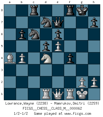 Last move : 1/2-1/2 2013 June 14 18:45:30 [Event "FICGS__CHESS__CLASS_M__000062"] [Site "FICGS"] [Date "2013.05.01"] [Round "1"] [White "Lowrance,Wayne"] [Black "Mamrukov,Dmitri"] [Result "1/2-1/2"] [WhiteElo "2238"] [BlackElo "2259"] 1.e4 e6 2.d4 d5 3.Nc3 Nf6 4.Bg5 Be7 5.e5 Nfd7 6.Bxe7 Qxe7 7.f4 O-O 8.Nf3 c5 9.Nb5 Nc6 10.Bd3 f6 11.c3 a6 12.Nd6 cxd4 13.cxd4 g5 14.O-O gxf4 15.Qe2 fxe5 16.dxe5 Nc5 17.Rad1 b6 18.Bc2 Bd7 19.a3 a5 20.Qe1 Be8 21.Nxe8 Raxe8 22.b4 axb4 23.axb4 Nd7 24.Ba4 Rc8 25.Nd4 1/2-1/2 French : Classical, Steinitz variation Kingside Castling by player Black (move 7) Kingside Castling by player White (move 14) This chess game ended in a draw. Follow this game move after move (download)Many Chess players were surprised when after the game, Fischer quietly explained: 'I had already analyzed this possibility' in a position which I thought was not possible to foresee from the opening. (Mikhail Tal) Die größte Kunst beim Schach besteht darin dem Gegner nicht zu zeigen was er tun kann. (Garry Kasparov) El Ajedrez es el juego mas altamente simbólico, pero las agresiones estan por lo tanto aún mas francamente representadas en la partida. Tal vez comenzo como un juego de guerra; Algo como la representación de una batalla en miniatura entre las fuerzas de dos reinos. (Karl Meninger) Le jeu d'échecs est comme rejeté hors du temps. (Antoine de Saint-Exupéry) For to win one hundred victories in one hundred battles is not the acme of skill. To subdue the enemy without fighting is the acme of skill. (Sun Tzu)