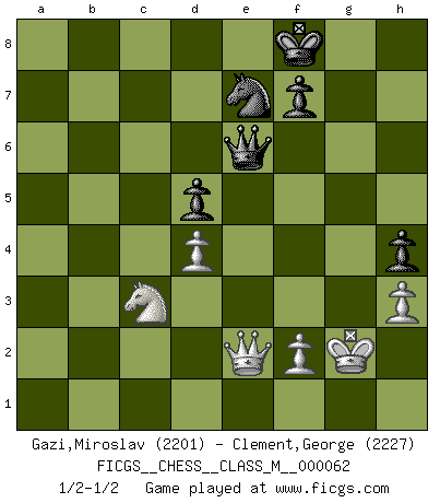 Last move : 1/2-1/2 2014 February 27 20:55:31 [Event "FICGS__CHESS__CLASS_M__000062"] [Site "FICGS"] [Date "2013.05.01"] [Round "1"] [White "Gazi,Miroslav"] [Black "Clement,George"] [Result "1/2-1/2"] [WhiteElo "2201"] [BlackElo "2227"] 1.d4 d5 2.c4 e6 3.Nc3 Nf6 4.Nf3 Be7 5.Bf4 O-O 6.e3 Nbd7 7.c5 Nh5 8.Bd3 Nxf4 9.exf4 b6 10.b4 a5 11.a3 c6 12.O-O Qc7 13.g3 Ba6 14.Bxa6 Rxa6 15.Qe2 Rfa8 16.b5 cxb5 17.Nxb5 Qc6 18.cxb6 Rxb6 19.a4 Qb7 20.Rfc1 Rc8 21.f5 Rbc6 22.Rxc6 Rxc6 23.Kg2 Bf8 24.fxe6 Rxe6 25.Qd1 Rc6 26.Qd2 Bb4 27.Qf4 h6 28.Ra2 Nb6 29.Ne5 Rc8 30.Qf3 Nc4 31.Re2 Nb6 32.Rb2 Qe7 33.Ra2 Qe6 34.Nd3 Qd7 35.Nxb4 axb4 36.Rb2 Rc4 37.Qd1 g5 38.Qe1 Nxa4 39.Rxb4 Rxb4 40.Qxb4 Nb6 41.Nc3 Qe6 42.h3 Nc8 43.Qc5 Ne7 44.Qc7 Kg7 45.Qa5 Qe1 46.Qb4 h5 47.Qb3 h4 48.gxh4 gxh4 49.Qc2 Qe6 50.Qe2 Kf8 1/2-1/2 QGD : Classical variation (5.Bf4) Kingside Castling by player Black (move 5) Kingside Castling by player White (move 12) This chess game ended in a draw. Follow this game move after move (download)You cannot play at Chess if you are kind-hearted. (French Proverb) Ich war schon mal beim Dopingtest. Da musste ich Urin abgeben, während Dritte zusahen. (Elisabeth Pähtz) Creo que una cierta cantidad de temperamento es esperada de los genios del Ajedrez. (Ron Gross) Que feriez-vous si vous étiez en train de jouer aux échecs et que la fin du monde arrive ? Je continuerais à jouer. (Saint Borromée) Statistics can be made to prove anything - even the truth. (Author unknown)